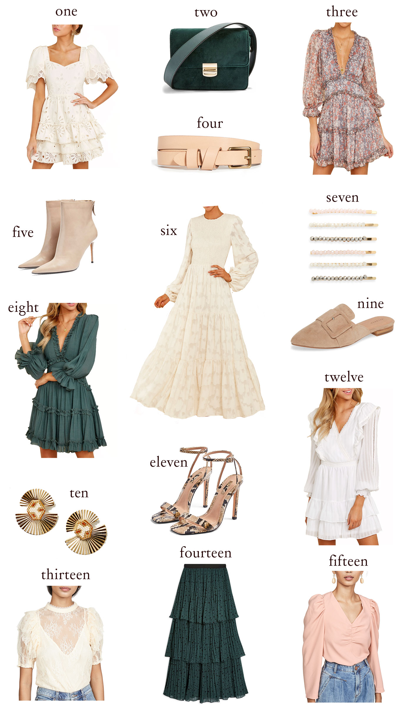 1. WHITE EYELET DRESS (UNDER $100) | 2. GREEN CROSSBODY (UNDER $50) | 3. FLORAL RUFFLED DRESS (UNDER $100 – COMES IN 9 COLORS) | 4. NUDE BELT (UNDER $50) | 5. NUDE BOOTIES (UNDER $100) | 6. IVORY MAXI DRESS (CAN’T BELIEVE THIS ONE IS UNDER $100!) | 7. EMBELLISHED BOBBY PINS | 8. GREEN RUFFLED MINI DRESS (UNDER $100 – COMES IN 9 COLORS) | 9. NUDE MULES (ON SALE UNDER $100) | 10. EARRINGS (UNDER $50) | 11. ANIMAL PRINT SANDALS (UNDER $100 – COMES IN 4 COLORS) | 12. WHITE RUFFLED MINI DRESS | 13. LACE TRIM TOP | 14. LAYERED SKIRT (UNDER $100) | 15. BLUSH BLOUSE