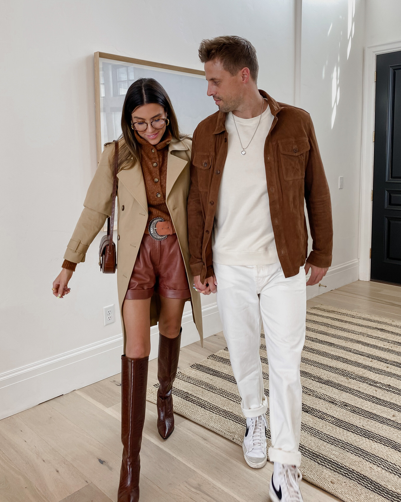 DETAILS: LEATHER SHORTS (UNDER $30 VERSION HERE) | BROWN SWEATER | TRENCH (UNDER $100 VERSION HERE) | CROSSBODY | BLUSH BELT | BOOTS | BLUE LIGHT GLASSES | TWISTED HOOPS | GOLD RING
