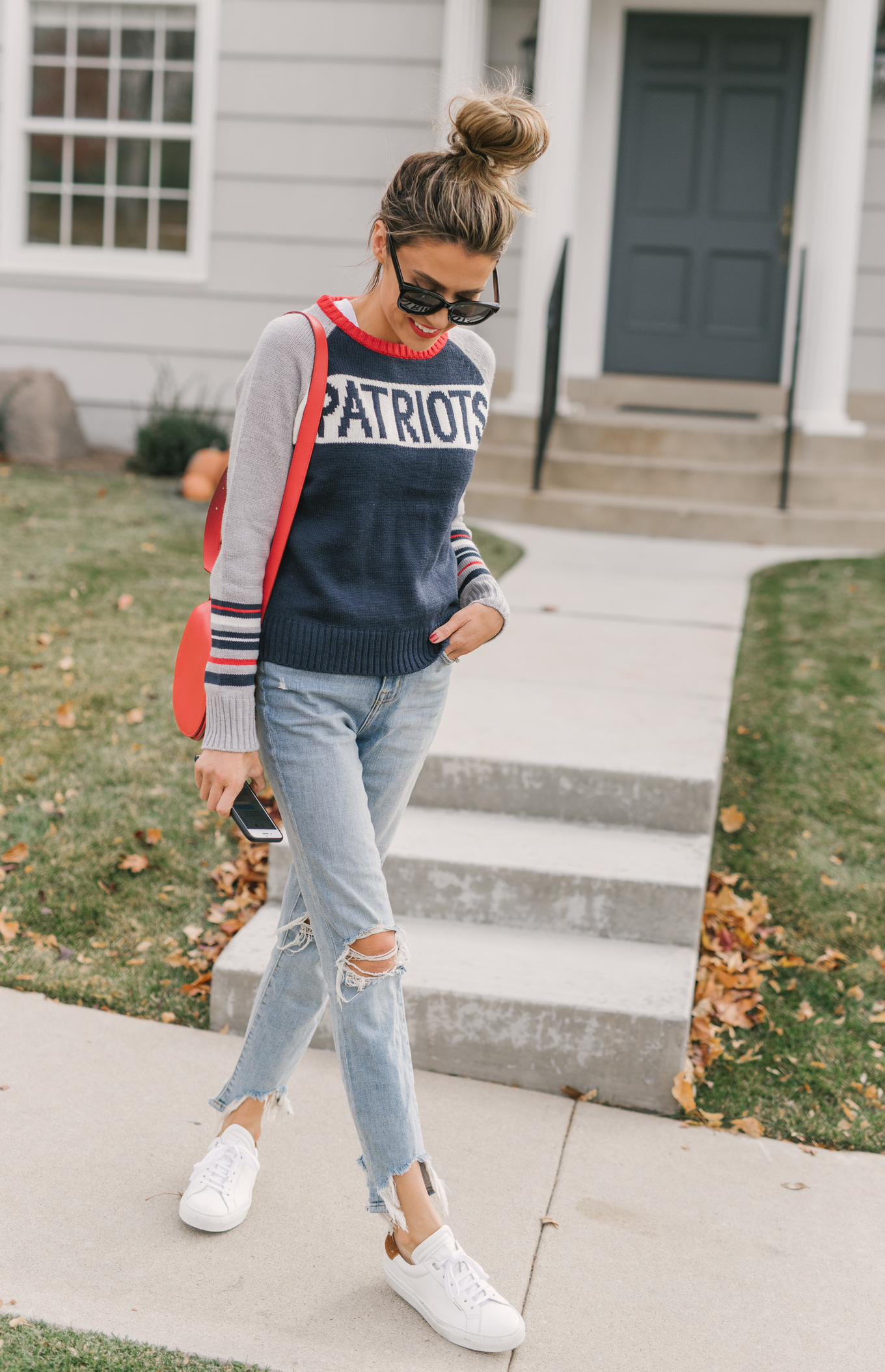 DETAILS: PATRIOTS SWEATER | DENIM | SNEAKERS