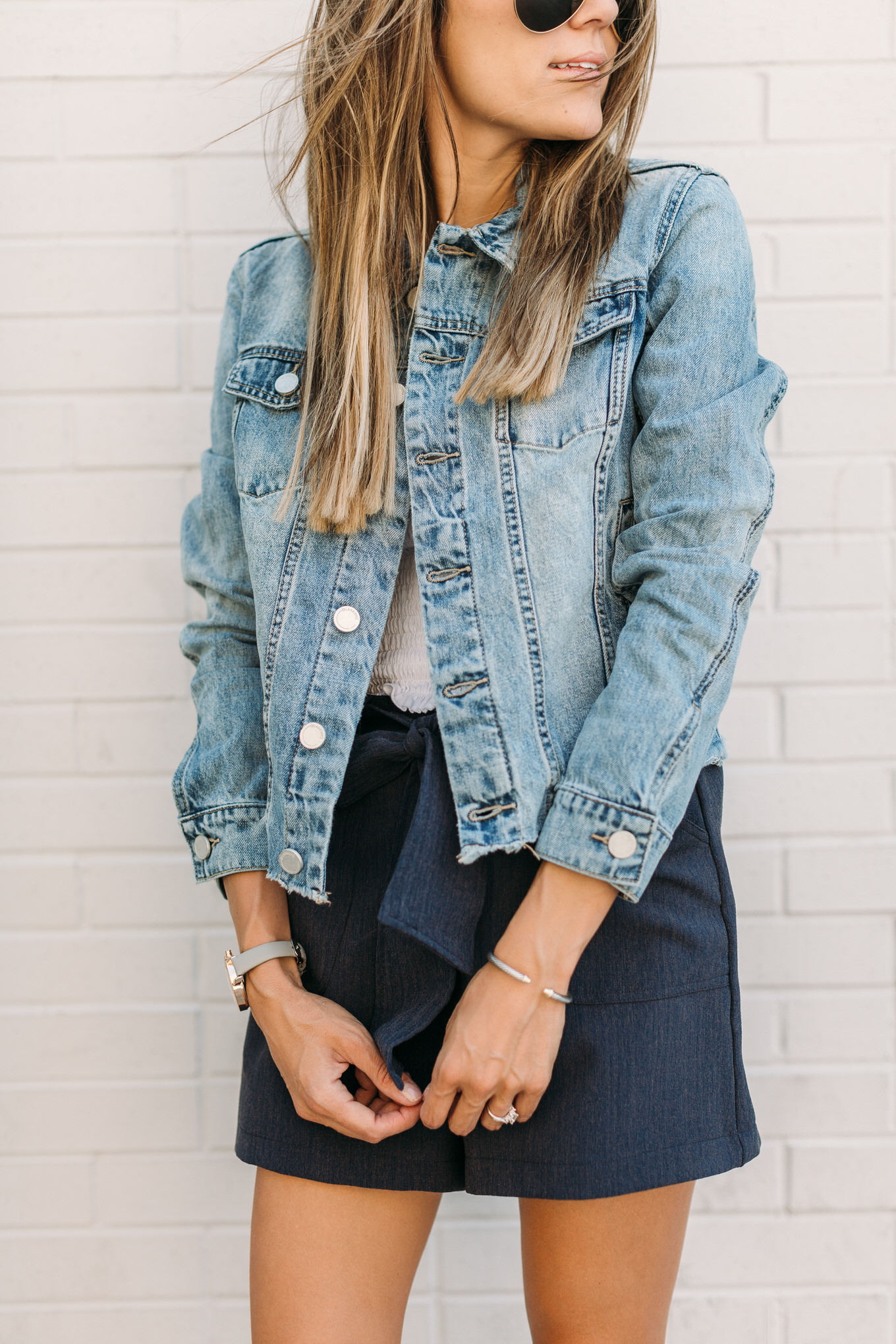DETAILS: BLUE SENREVE BAG | WHITE SHIRRED TOP | NAVY BOW SHORTS | DENIM JACKET | WHITE LOAFERS | AVIATORS