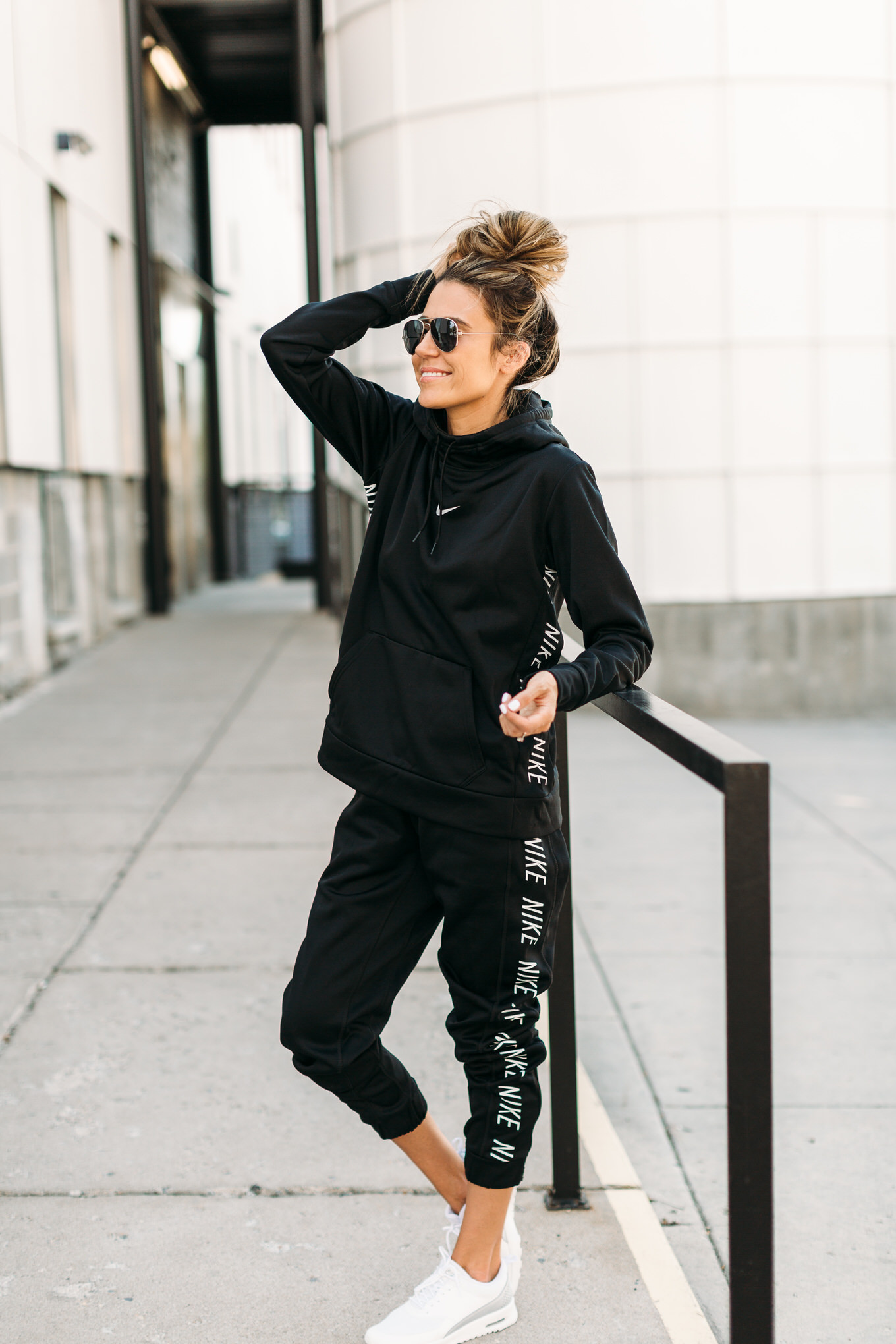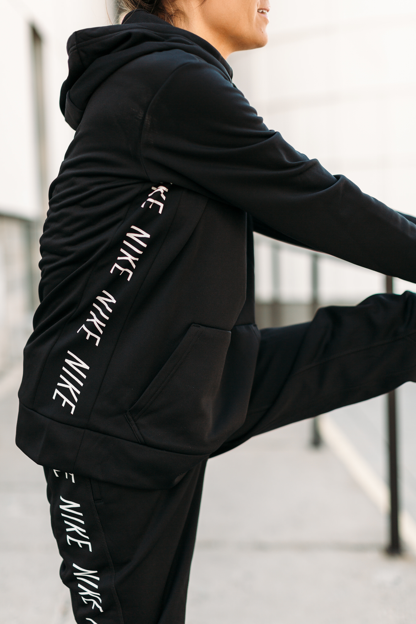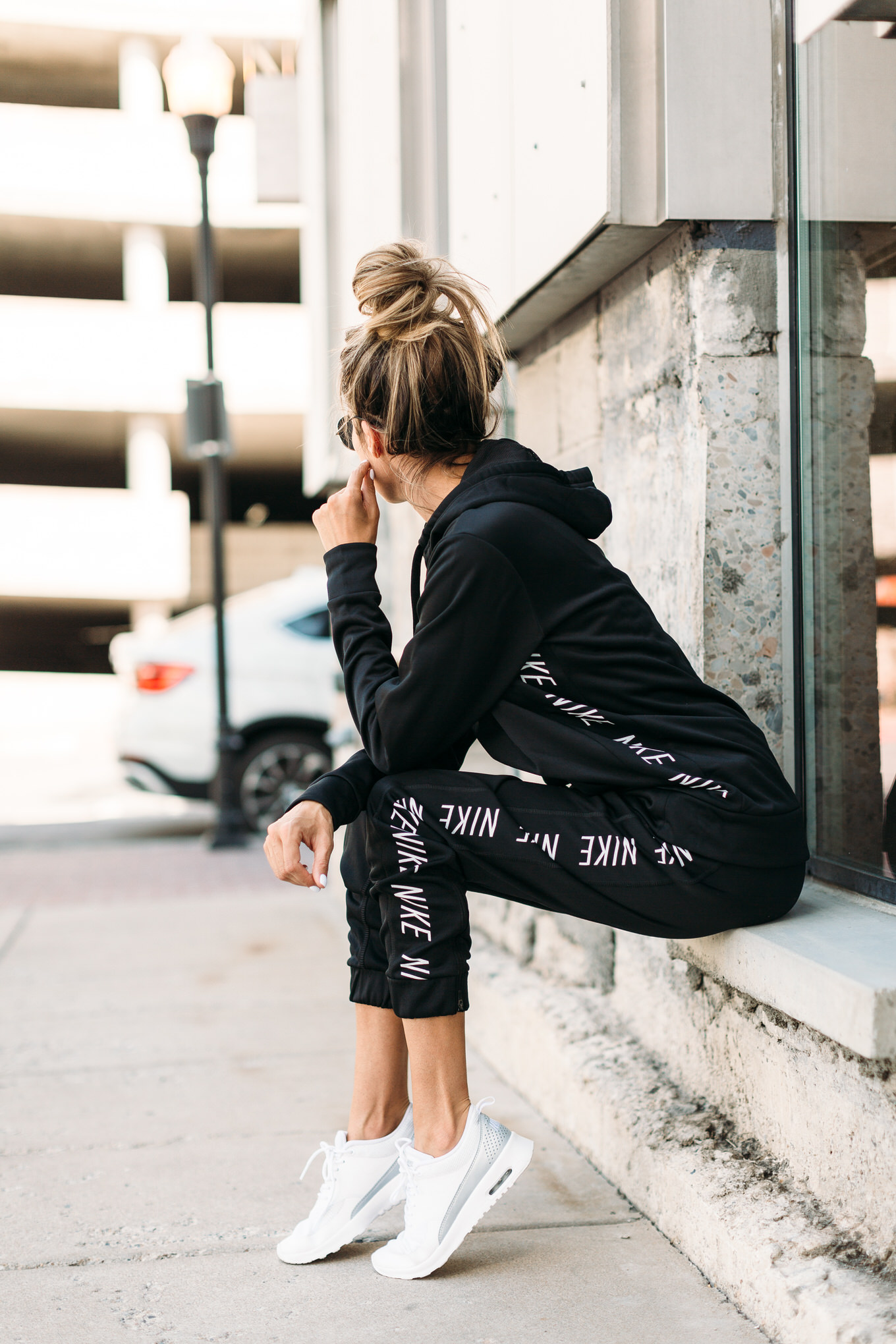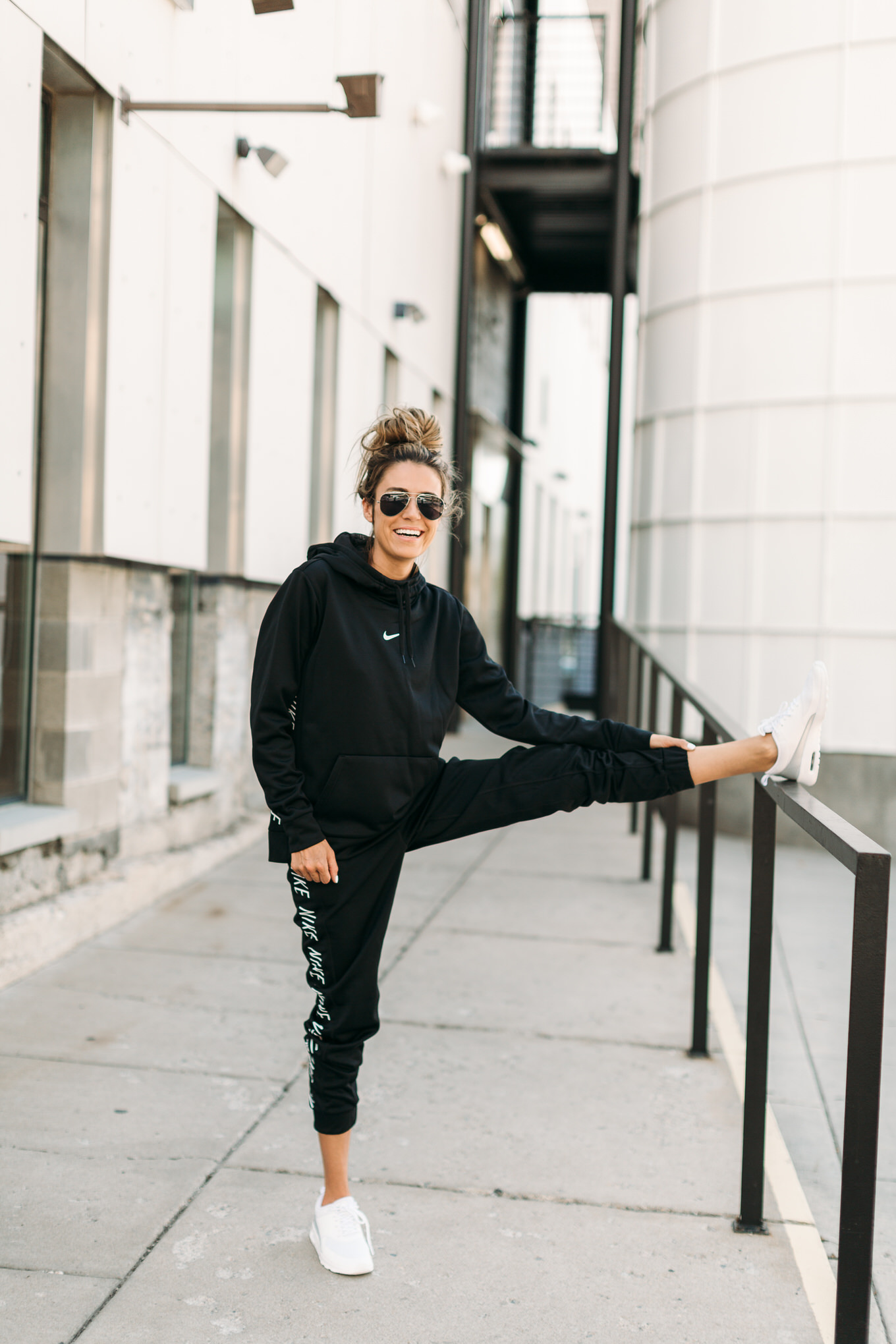 DETAILS: NIKE HOODIE (WEARING SIZE MEDIUM – I ALWAYS SIZE UP ON SWEATSHIRTS) | BLACK NIKE JOGGERS (LOVE THESE – ON SALE UNDER $50 – WEARING SIZE SMALL) | WHITE SNEAKERS (SIMILAR HERE)