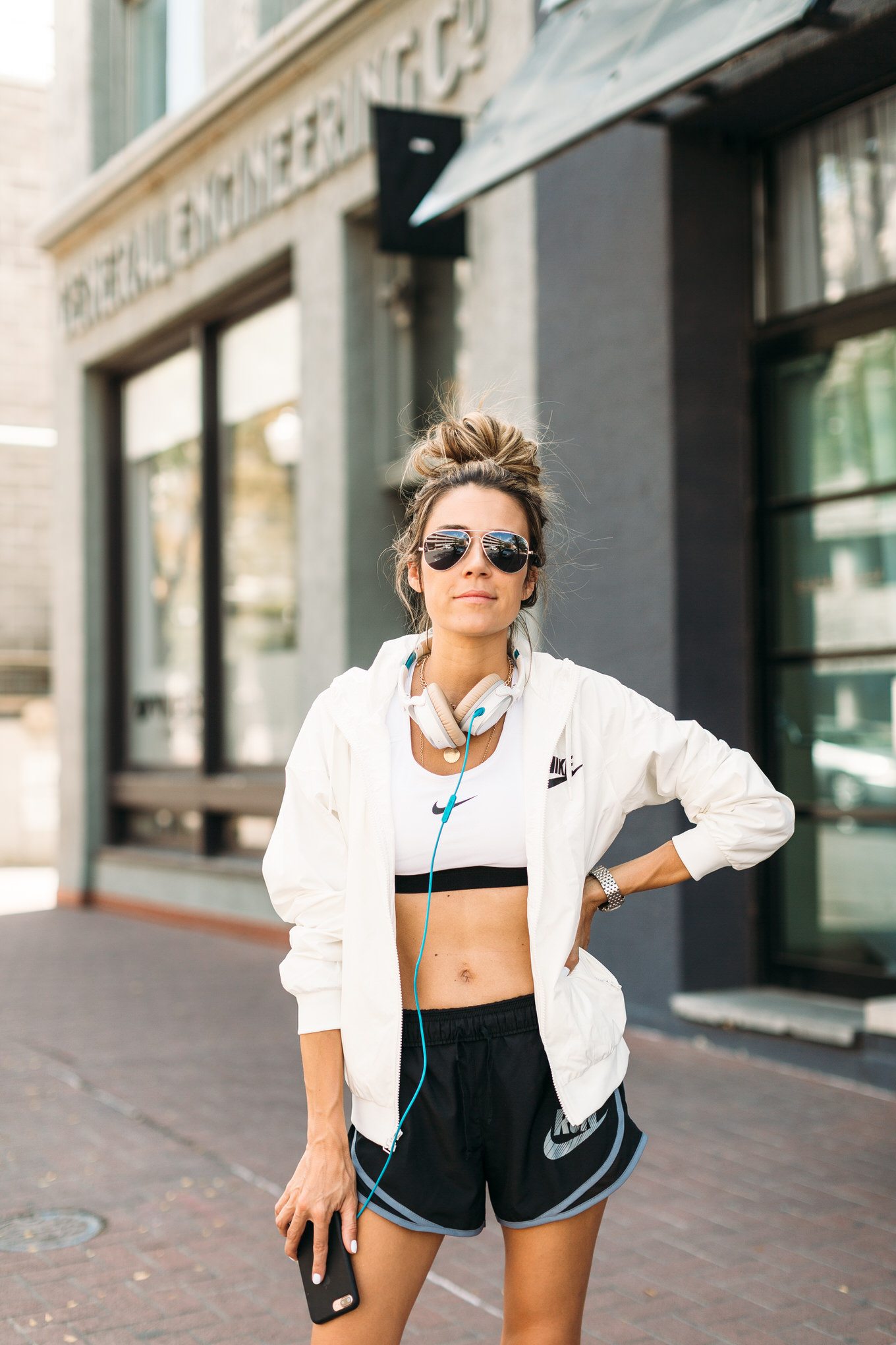 DETAILS: WHITE WINDBREAKER (WEARING SIZE MEDIUM) | WHITE NIKE SPORTS BRA (WEARING SIZE MEDIUM) | BLACK SHORTS (ON SALE – 25% OFF – WEARING SIZE SMALL) | HEADPHONES (SIMILAR HERE ON SALE) | BLACK NIKE SNEAKERS