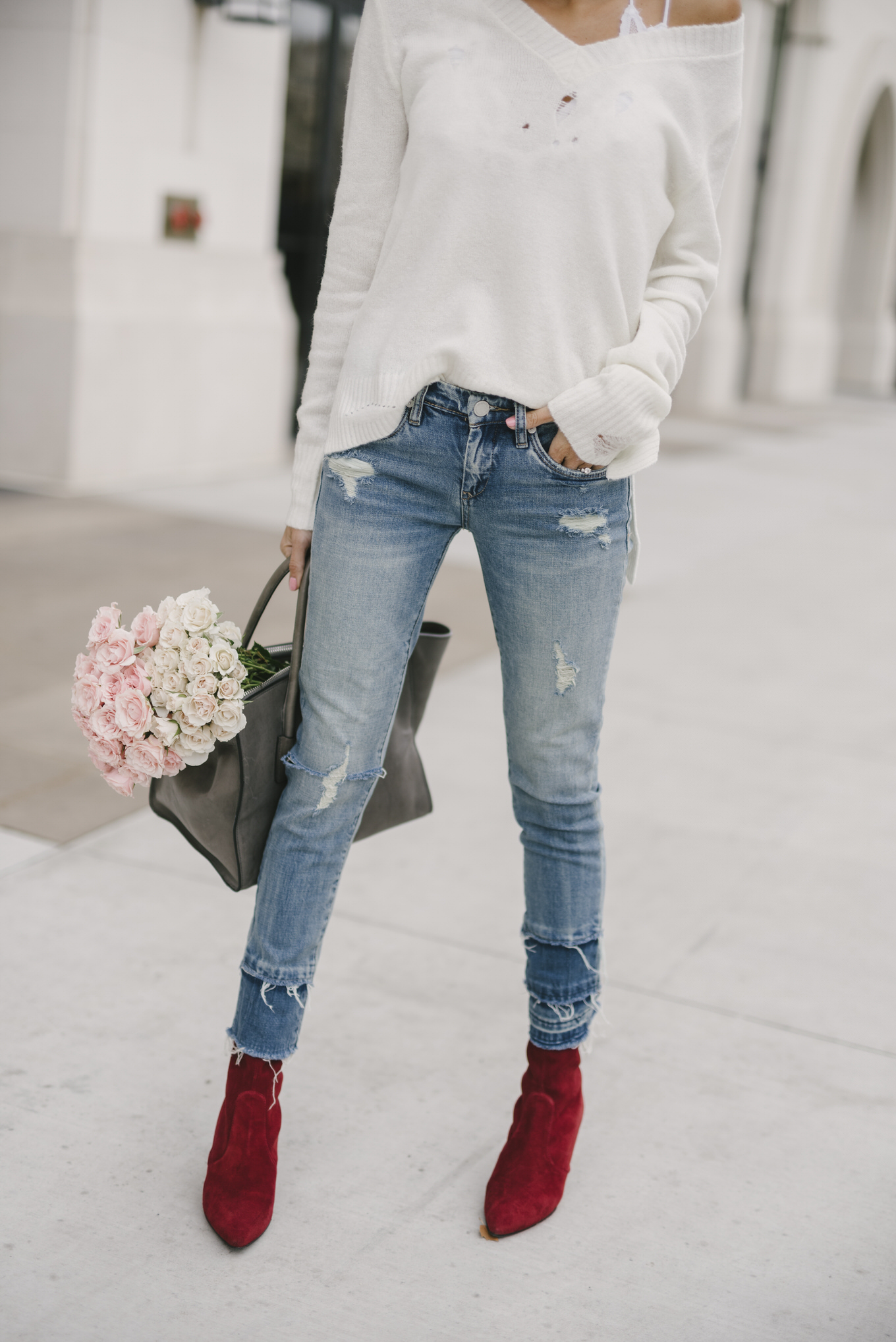 The simplest ways to transform a look for Valentine’s Day are sometimes the best! Add a red bootie and, to transition for night, just a swipe of red lipstick and you can make any outfit V-Day ready. I love this distressed sweater (UNDER $50) for an edgy, casual vibe and it’s seriously sooo soft!
