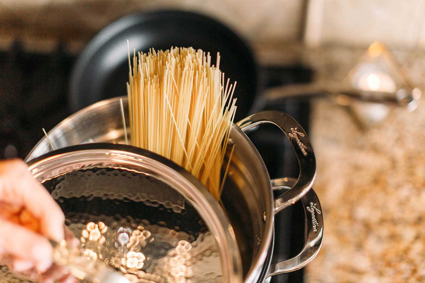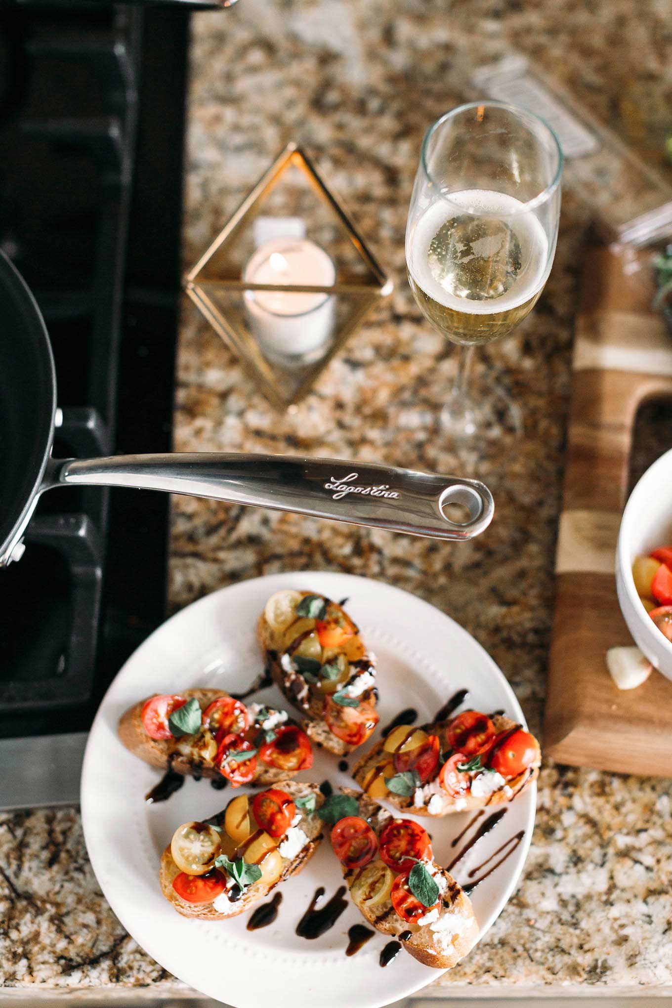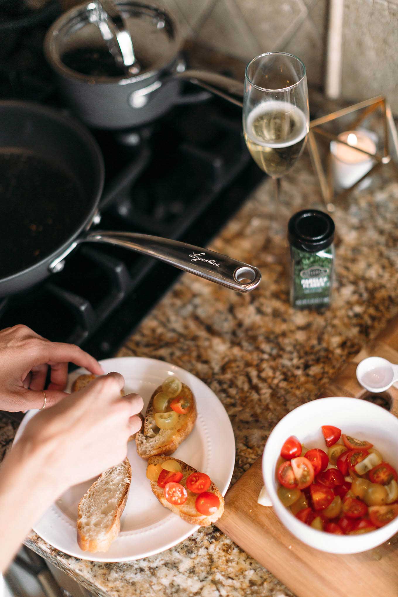 - Try something new. For us it’s cooking. We are both not the best cooks. When you can’t rely on your cooking skills, you for sure need to invest in good cookware so we just got this Lagostina set. It’s comical because we are such beginners we were making this Italian chicken dish the other night and we literally had to google how to crush garlic because we weren’t sure if there was a specific technique or what?! (so embarrassing!) We got halfway through and realized we didn’t have a brush for the olive oil and bruschetta, and improvised with garlic cloves and tomatoes to spread the olive oil across the bread. Honestly I feel like it’s those moments that make an experience more memorable. Having everything come easy and run smoothly is boring, it’s the funny mishaps that are memorable! We’ve also had those times when we plan to stay in for a romantic night and the kids just don’t stay occupied (or asleep if it’s their bedtime) – you can incorporate them and have them act as servers or put them on clean up duty so they get to participate. The Lagostina pots is dishwasher safe so it makes clean-up easy.