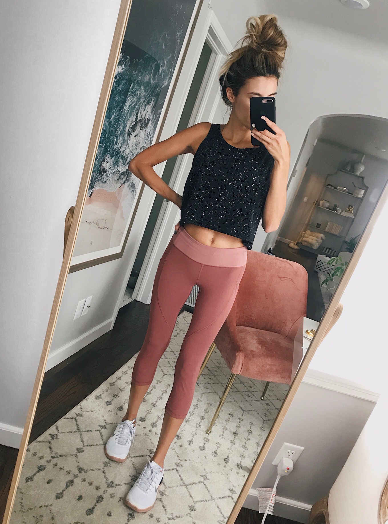 Love the sparkly top. I’m all for sparkly clothes that make a grueling workout seem more like going to a party! Also, wanted to know about your gorgeous rug and artwork. Where did you purchase those? xox