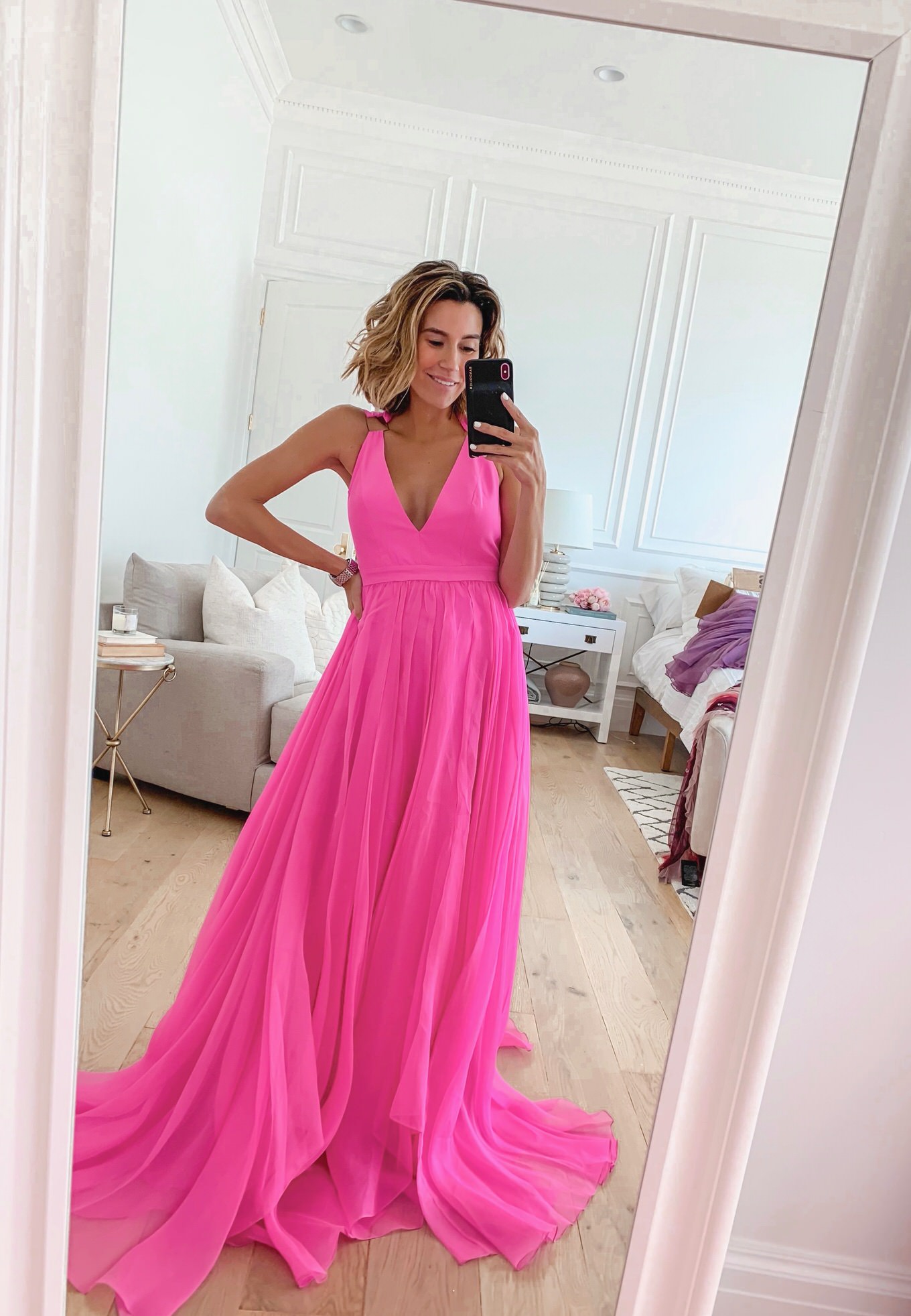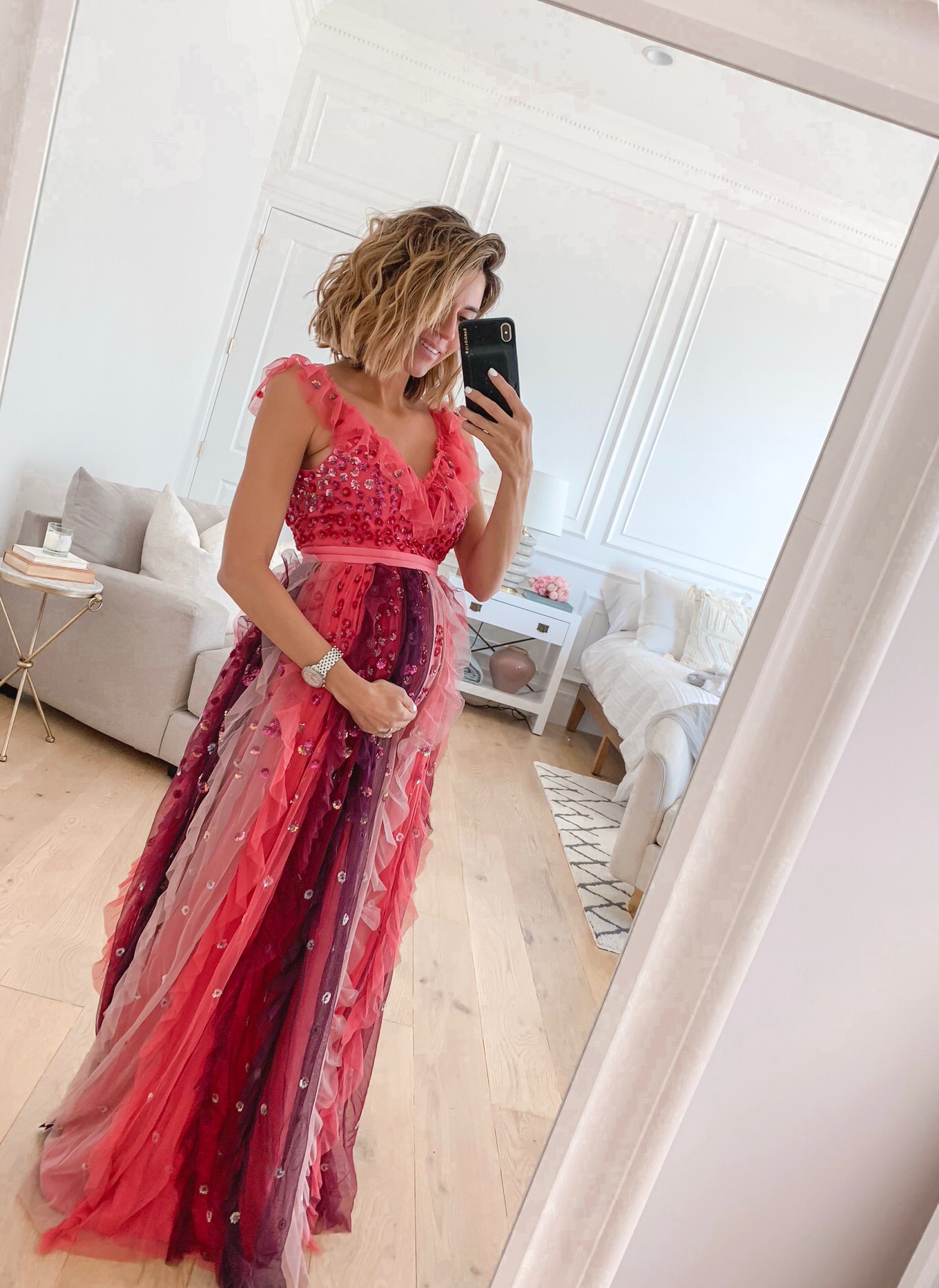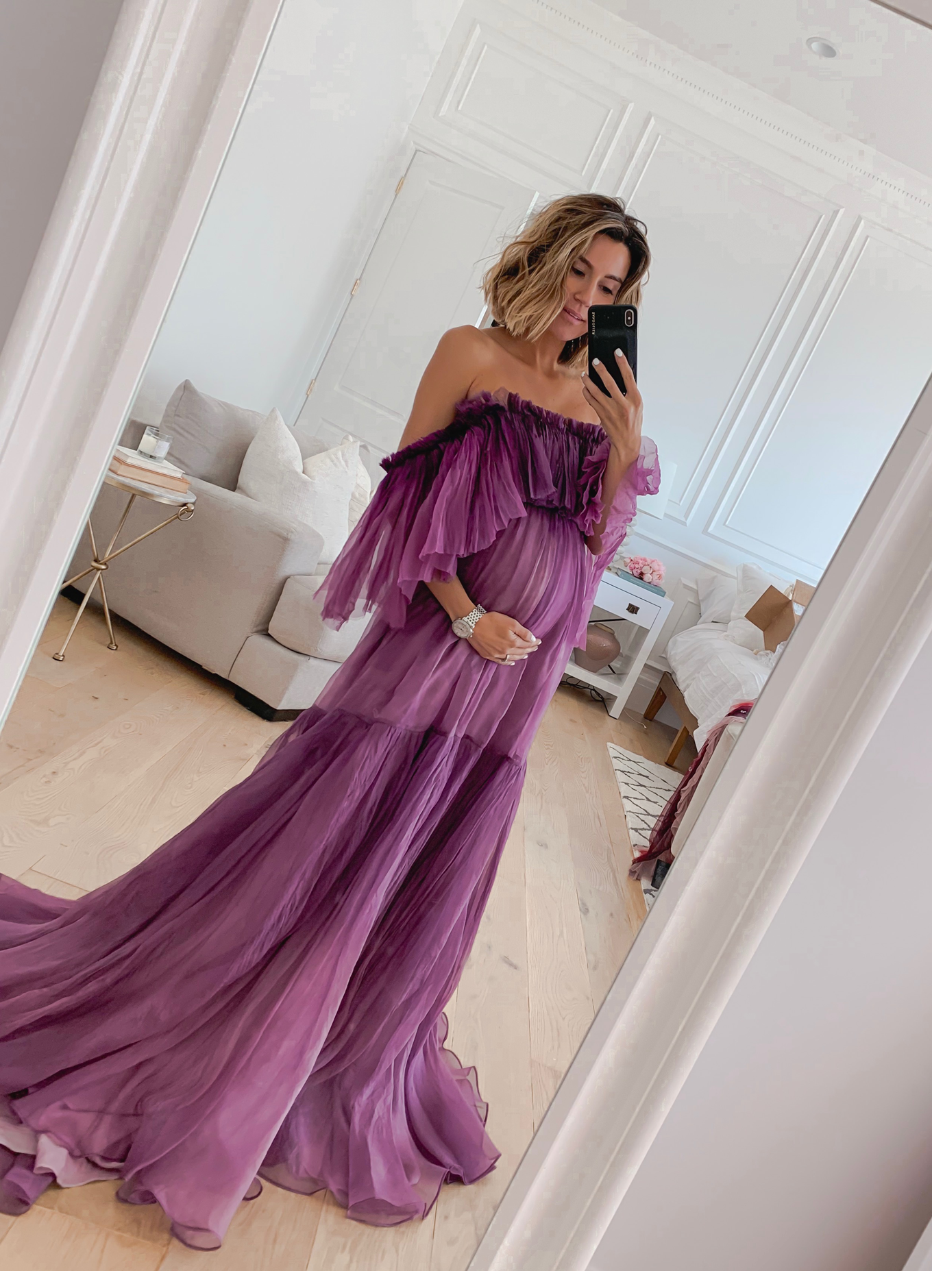 This. Dress!!! The first thing that got me was the silhouette with the gorgeous flowy pleats and sleeves, but when I saw it in person the hand-dyed effect on the color was insane. Honestly such a breathtaking piece of art! One small problem… I couldn’t zip it up 😭 Pregnancy life!!  I had sized up two sizes but underestimated how big my bump had gotten (especially in the evenings.) Still such an amazing dress and definitely one of my favorites.