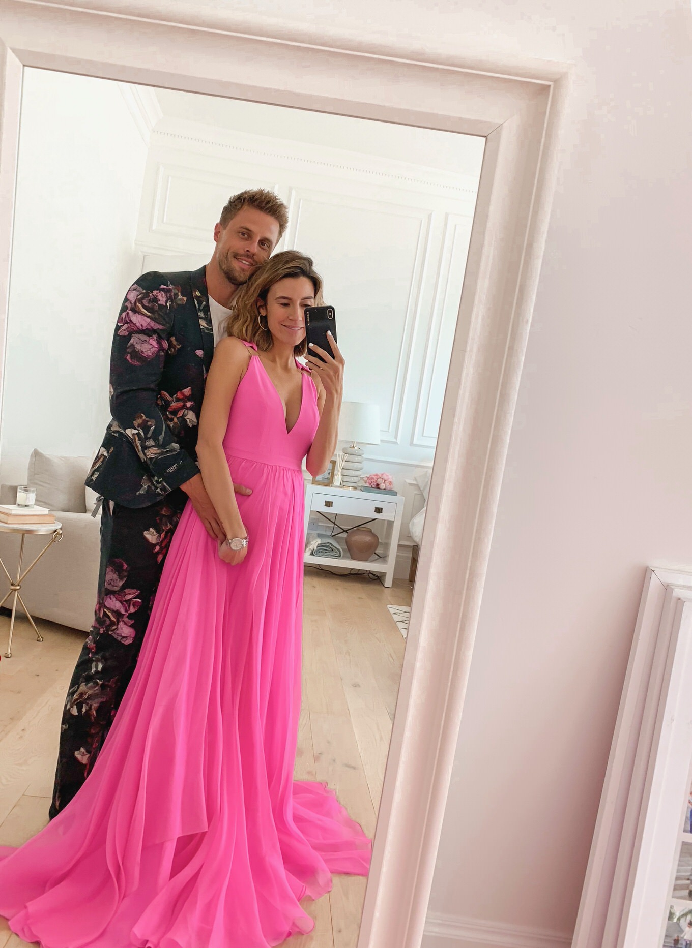 DETAILS: PINK DRESS | EARRINGS | CODY’S BLUE SUIT COAT & TROUSERS | CODY’S SNEAKERS