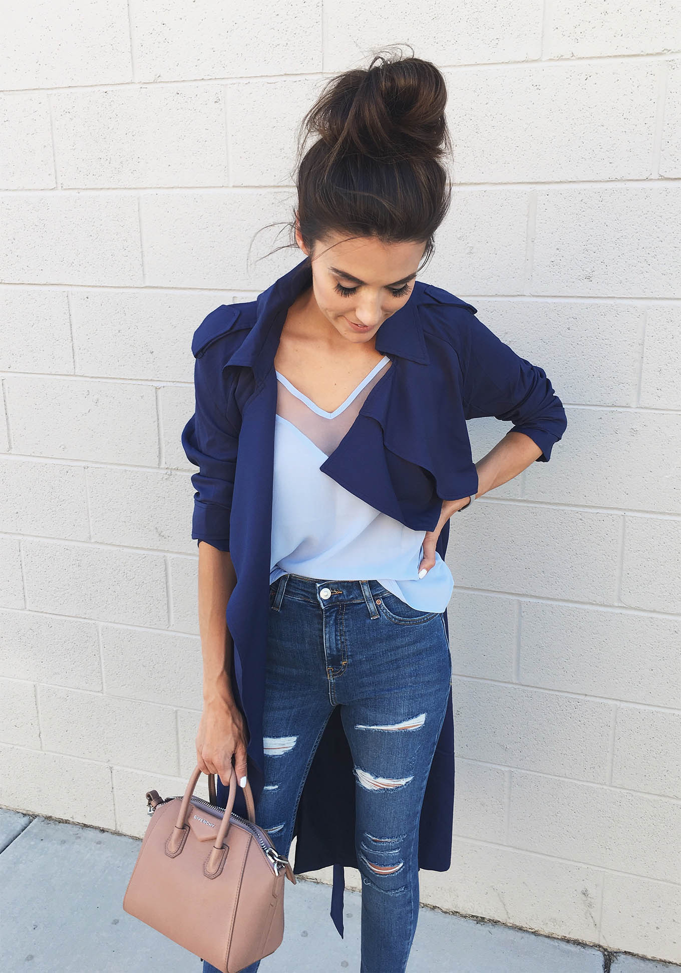 DETAILS: BLUE ILLUSION SLEEVELESS TOP (22% OFF – CODE: WEEKENDSALE) | NAVY TRENCH (22% OFF – CODE: WEEKENDSALE) | DISTRESSED HIGH-RISE DENIM (UNDER $60 – SIZE UP: WEARING SIZE 26 – MORE SIZES HERE) | NUDE MINI TOTE | GREY WATCH | NUDE HEELS | TORTOISE SUNGLASSES