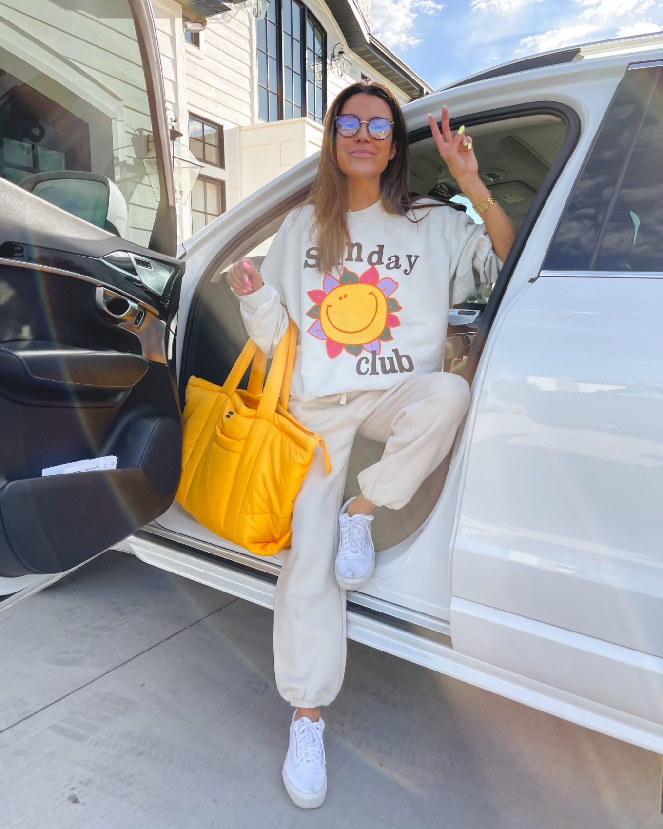 OBSESSED WITH THIS SWEATSHIRT!! This oversized sweatshirt is super fun with the bright colors! I’m wearing a size large here and you can even share it with your significant other since it’s unisex! This most-loved yellow cloud bag is so fun- it’s currently on sale for 30% off and comes in this light purple color as well.