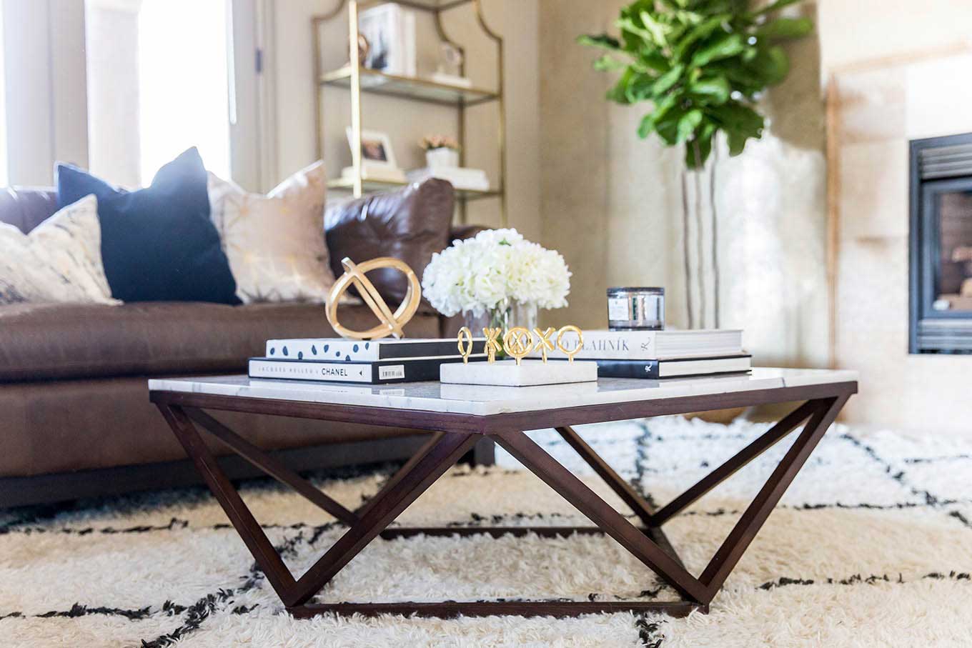 LIVING ROOM FURNITURE: LEATHER SECTIONAL SOFA | WHITE SWIVEL CHAIRS | TASSEL RUG | MARBLE TOP COFFEE TABLE | MARBLE TOP END TABLE (SIMILAR HERE) | GOLD BOOK SHELF (SIMILAR HERE)