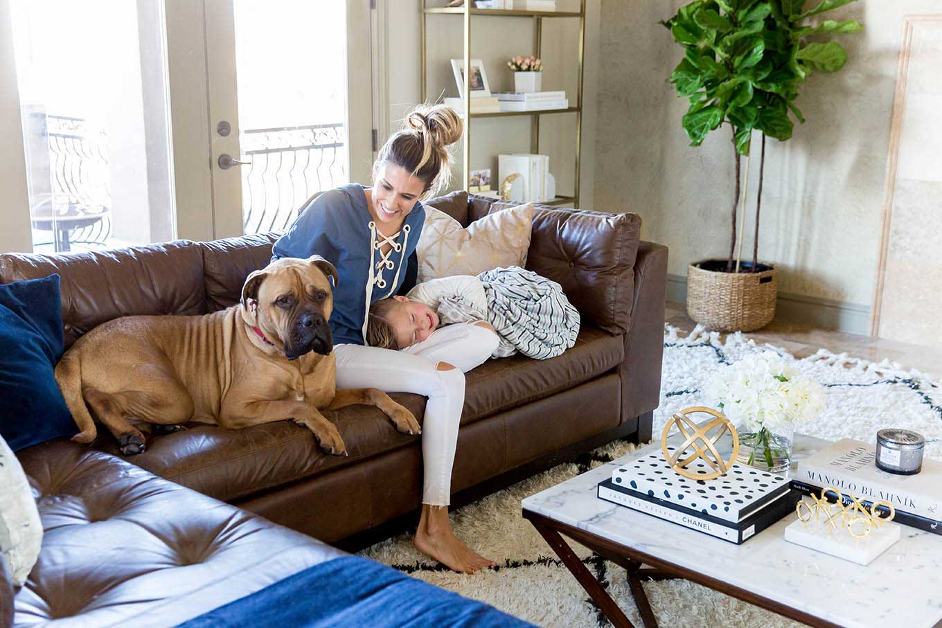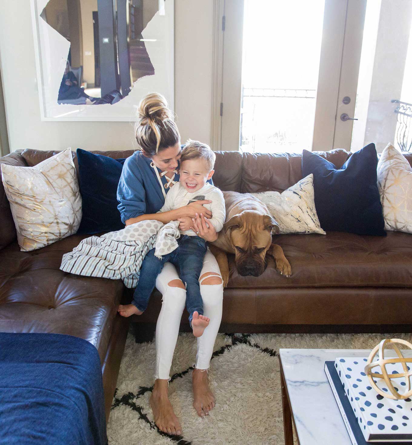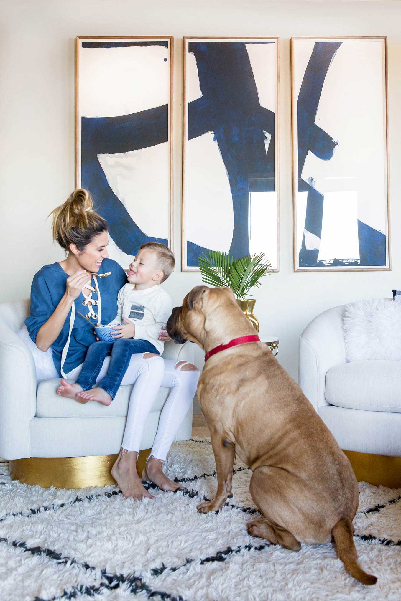 This leather sectional was the first piece of furniture we chose, and the more worn it gets the better it looks so it’s perfect for a young family. We also got these chairs custom-made from High Fashion Home and I love how they turned out, especially with the gold base to bring in the accent from the rest of the room. The fabric is really stain resistant! The kids have spilled everything from yogurt to Cheetos and there hasn’t been a stain we can’t get out yet (knock on wood!!). I’m also obsessed with the wall art we found at Zio Bios Creative. I love how both pieces really fill up the space I know they will flow perfectly in our new home.