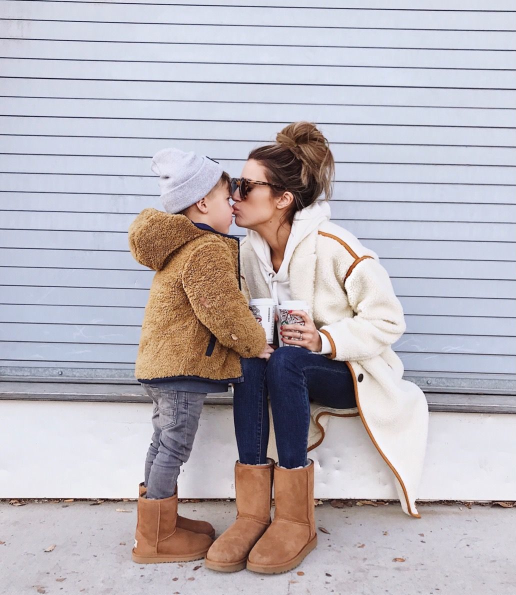 When I saw this cute little sherpa baby coat it triggered a memory of me and Beckam in matching sherpa and UGG boots (posting below) so I wanted to recreate it with Ollie! UGG boots were one of my first big purchases when I was in high school – I was so proud of them haha! They are still a staple today – my kids all have a pair and love them too. I just got this short version after seeing them style with more relaxed jeans or joggers and sweats. Since they are a little shorter there’s less bunching so you can style them with more than just your favorite leggings. Finding matching mama and boy clothes is sometimes then girl clothes – but sherpa and uggs is an easy universal way to coordinate.