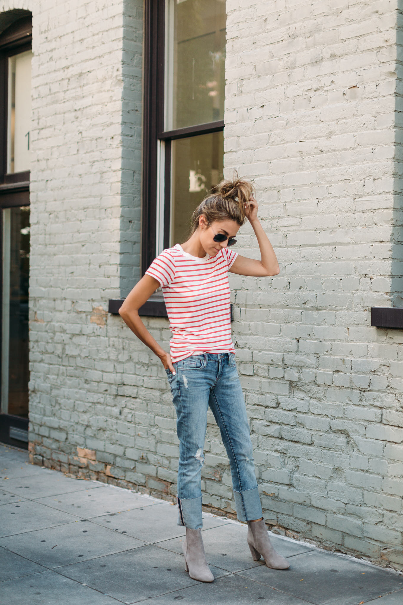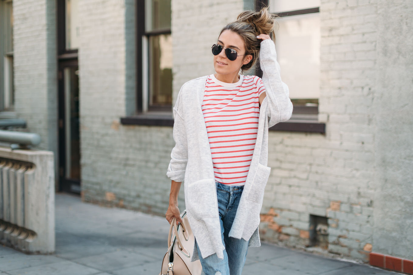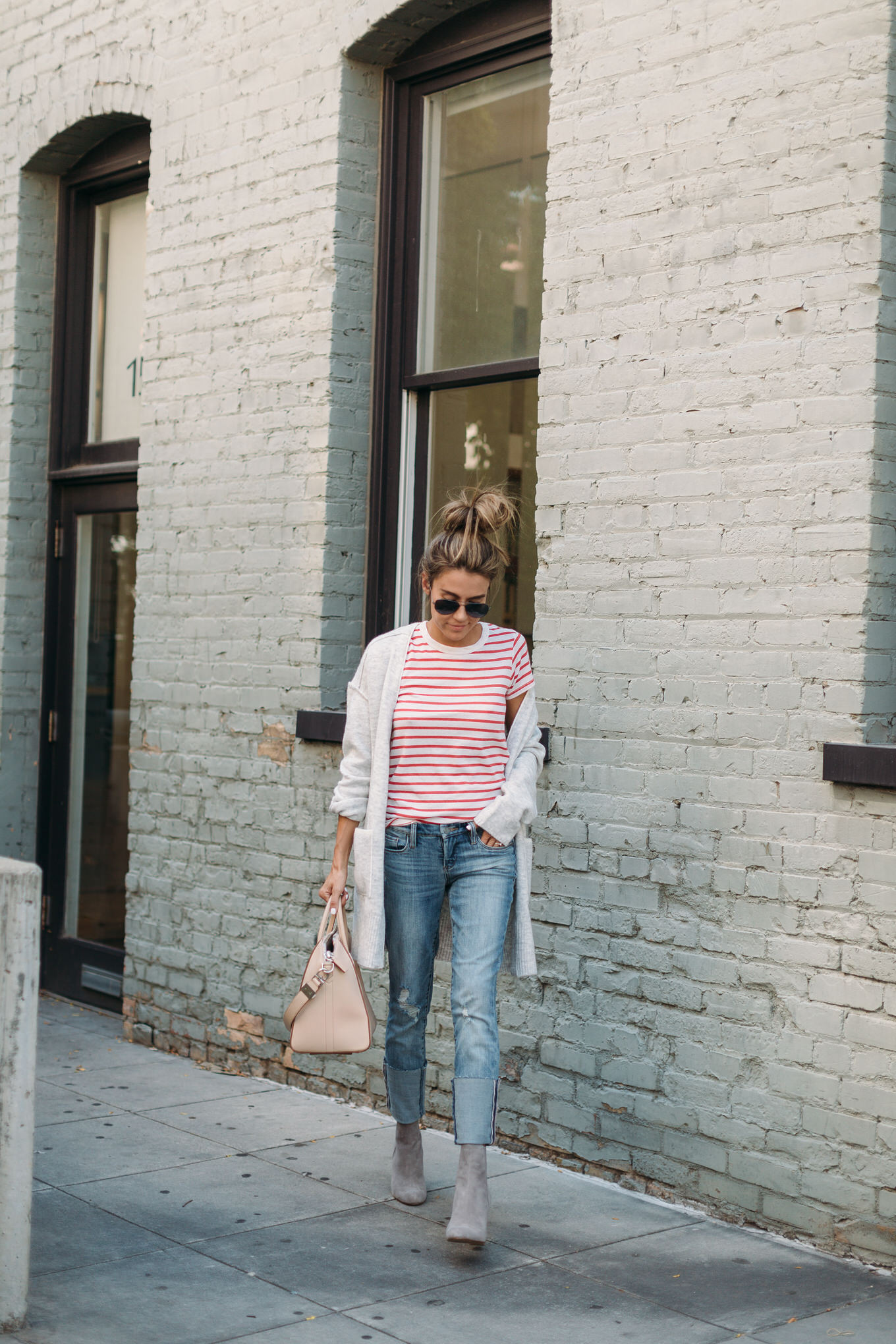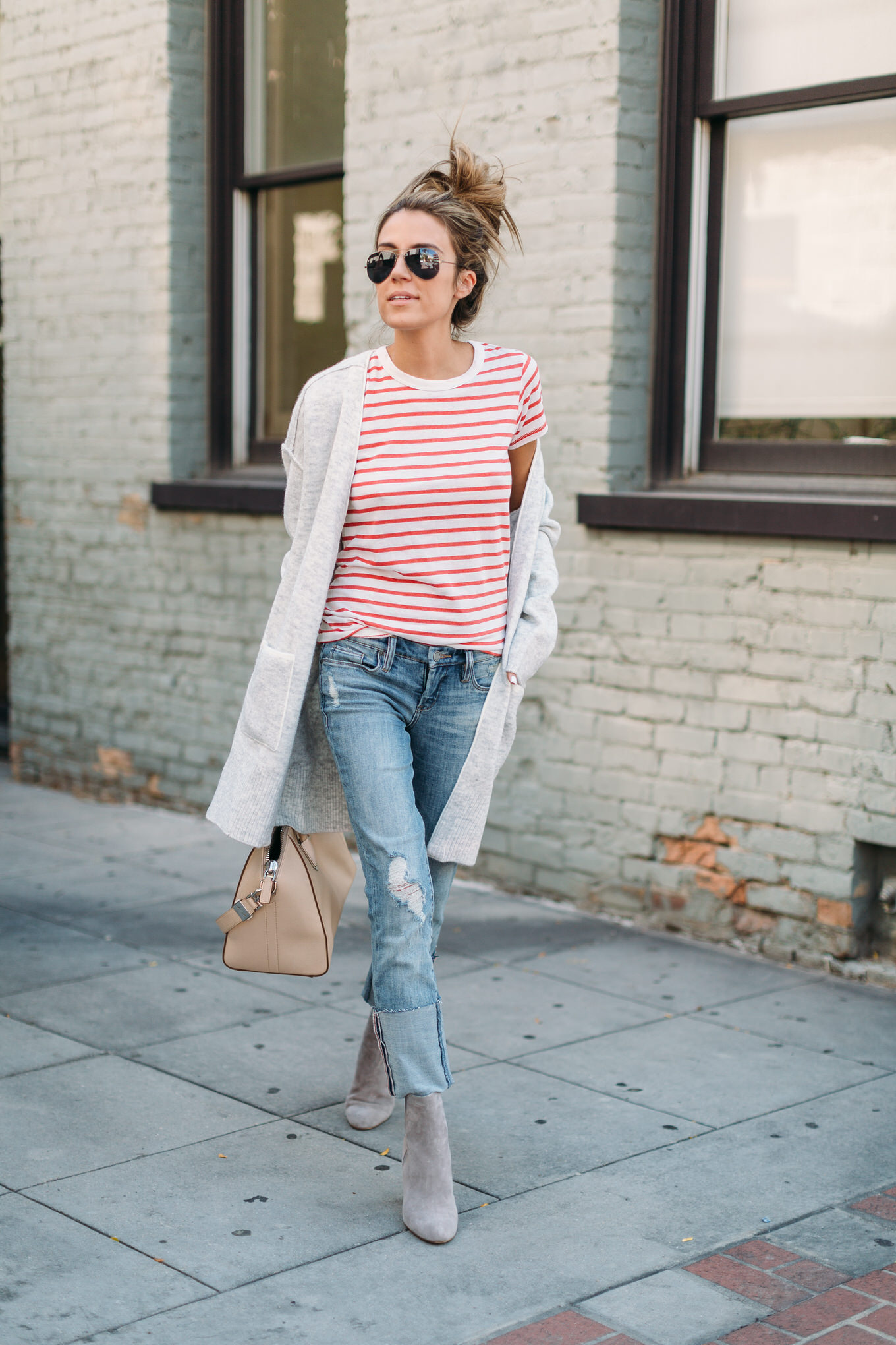 DETAILS: RED STRIPED TEE | DENIM (UNDER $100) | GREY CARDIGAN | GREY ANKLE BOOTS (ON SALE UNDER $100) | AVIATORS | NUDE SATCHEL