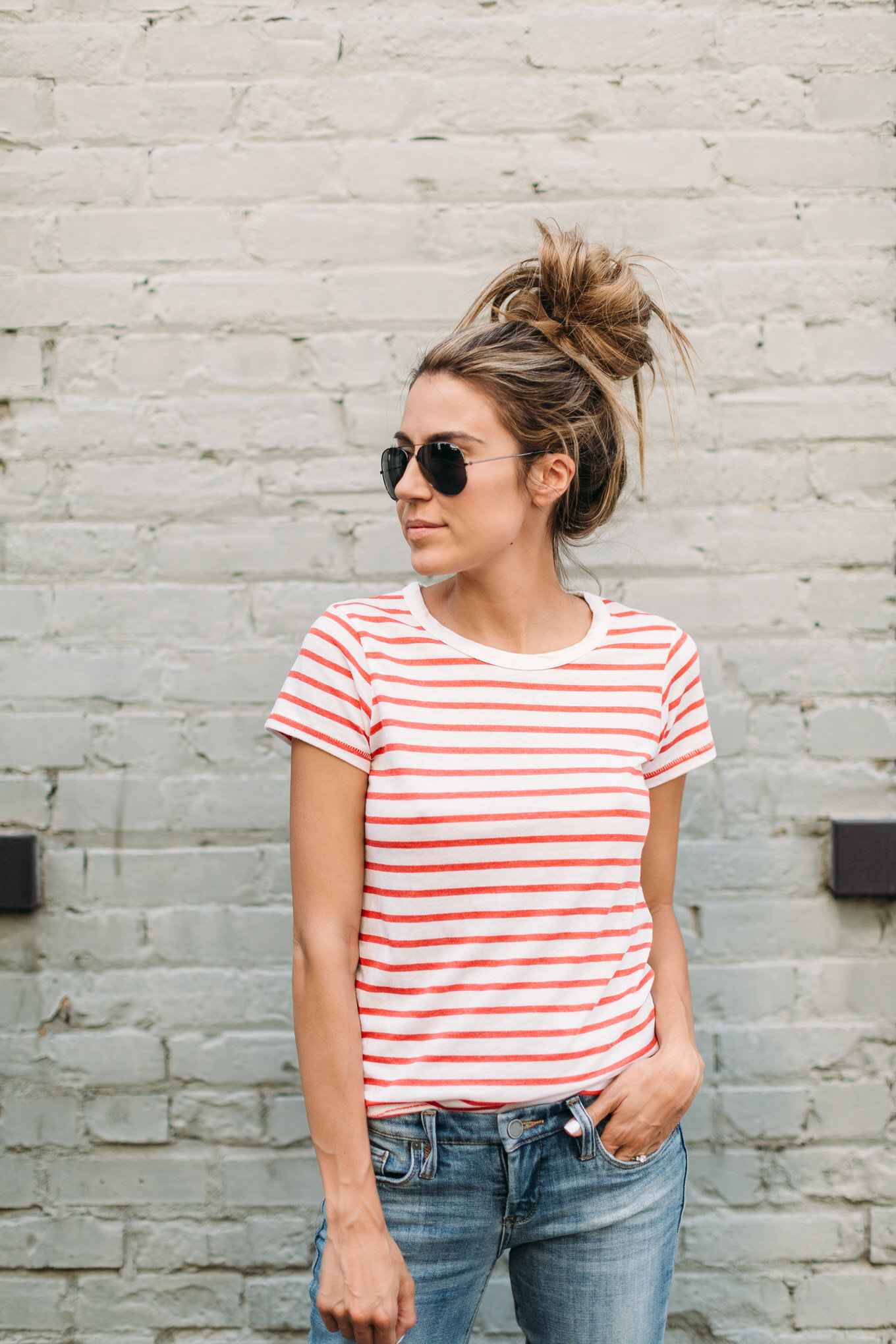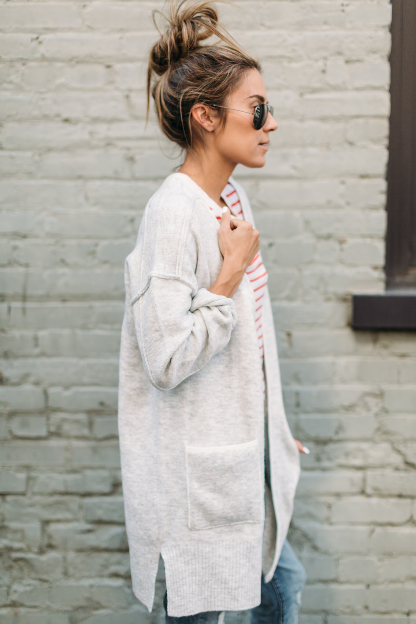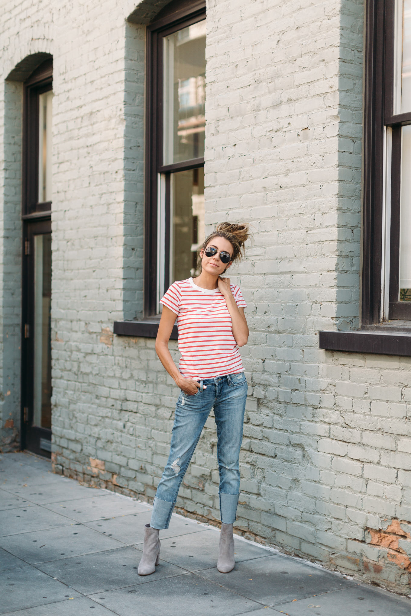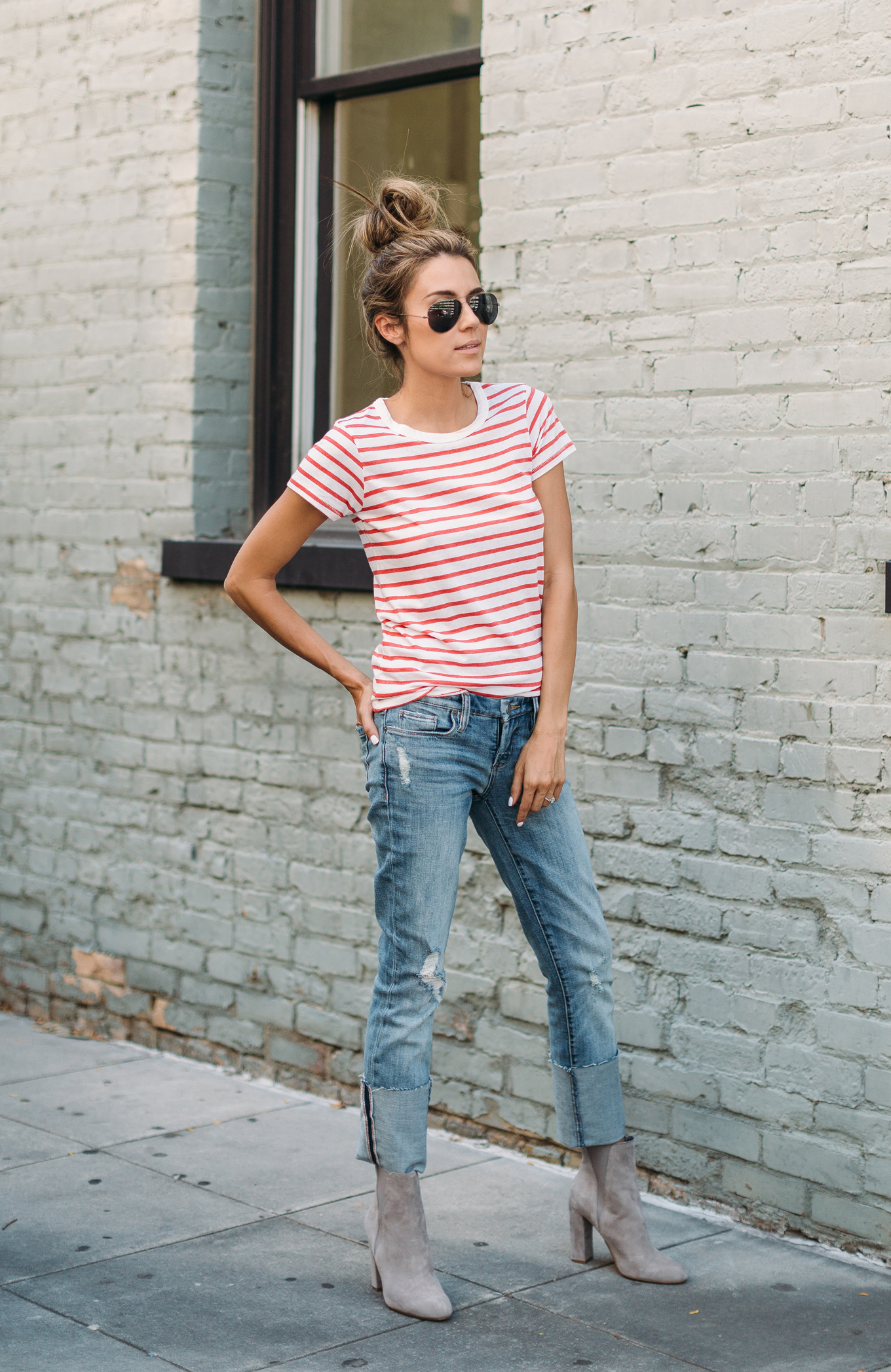 DETAILS: RED STRIPED TEE | DENIM (UNDER $100) | GREY CARDIGAN | GREY ANKLE BOOTS (ON SALE UNDER $100) | AVIATORS | NUDE SATCHEL