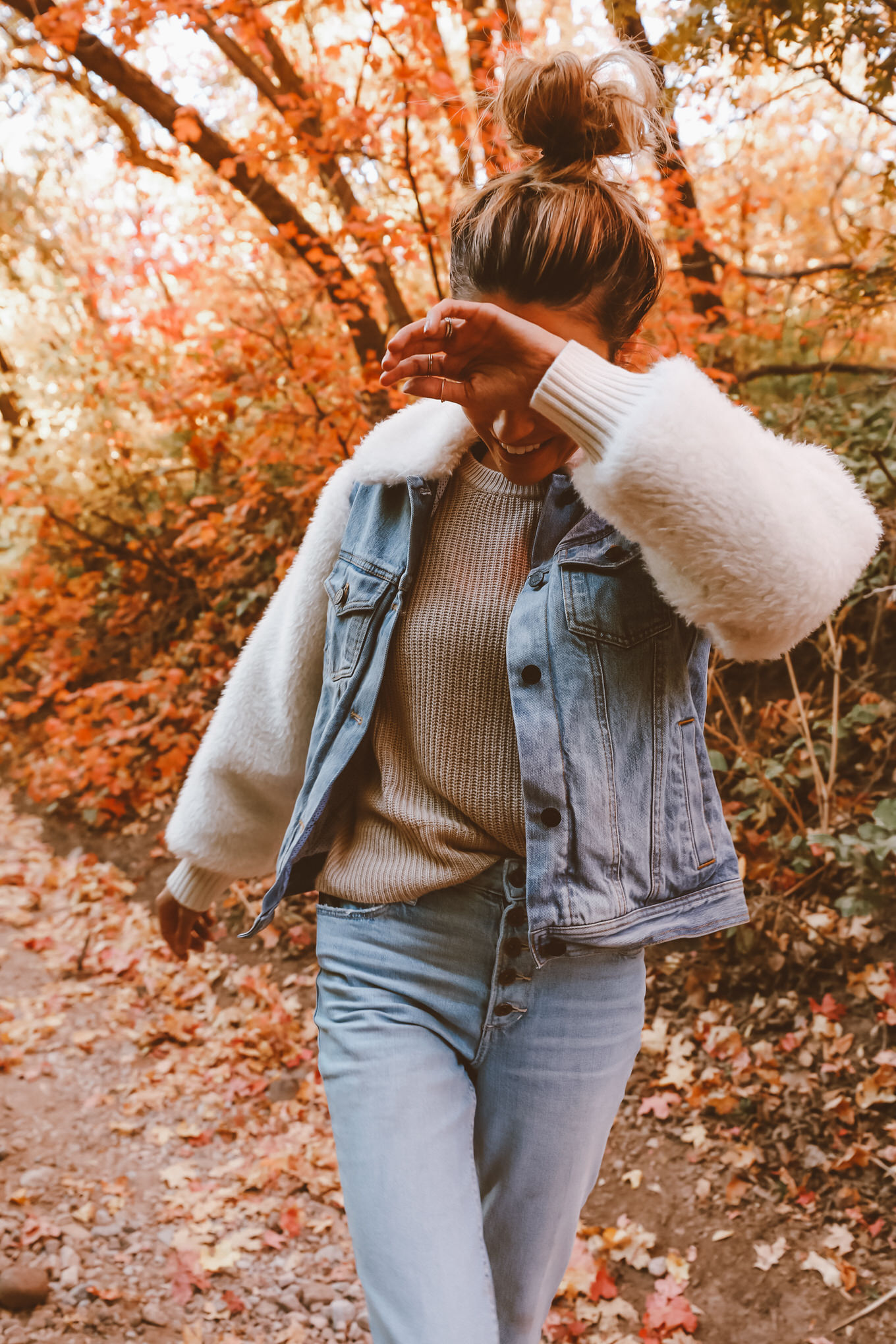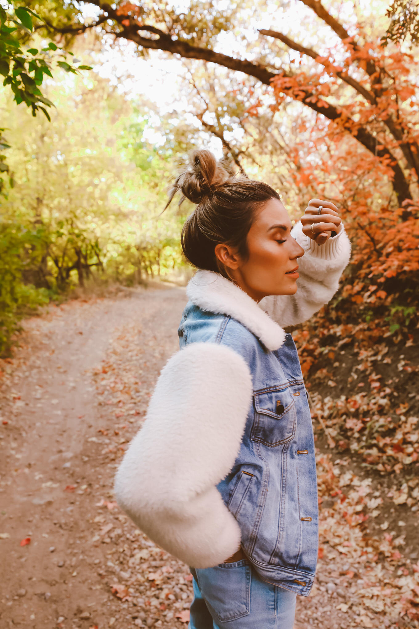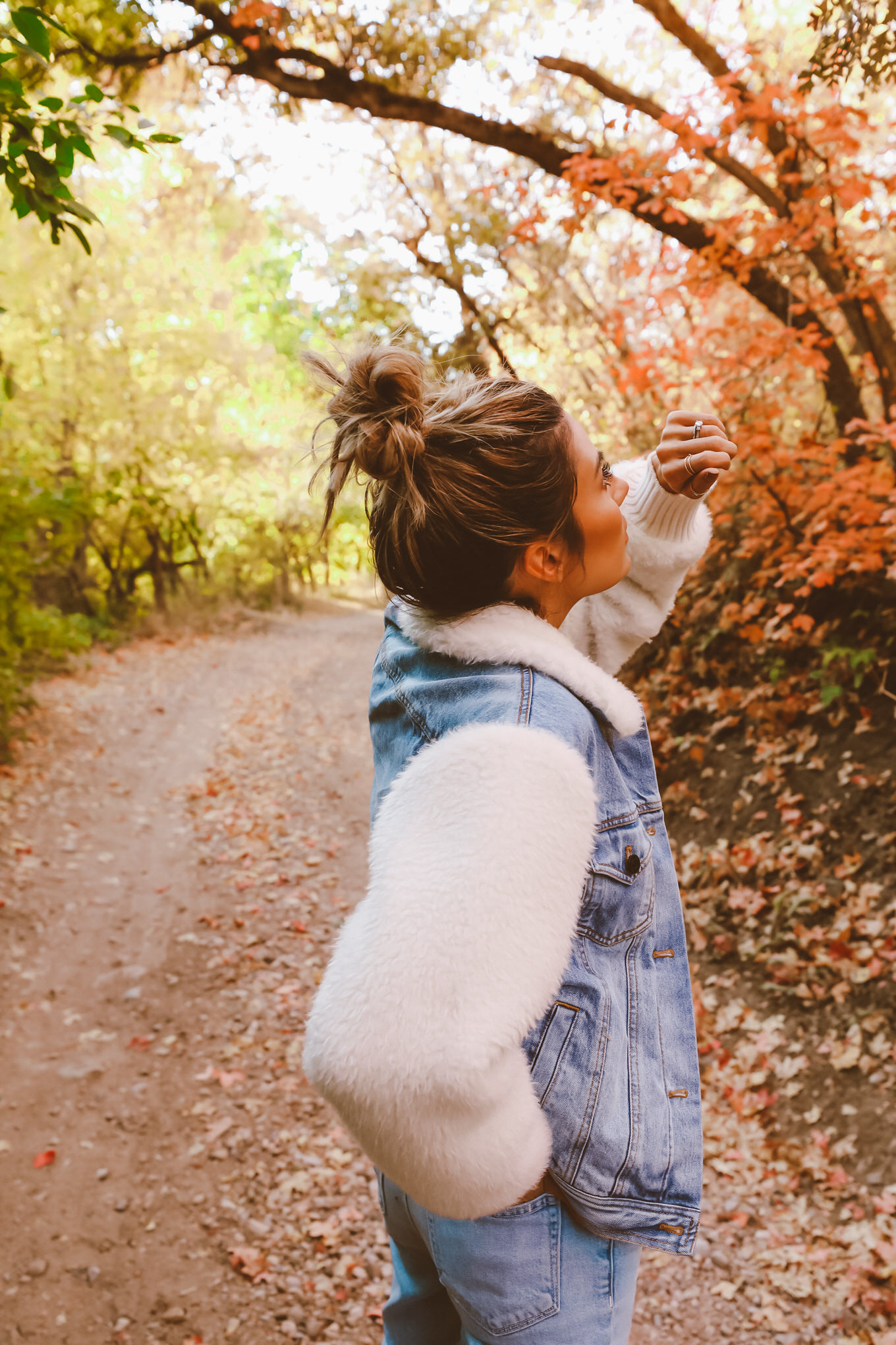 October is finally here!!! My favorite time of the year for so many reasons. In Utah the trees are the prettiest colors ever! We go on drives through the mountains for no reason, with no destination in mind. Cody got a new old school car that can go up in the mountains, or on rough trails so we went up the canyon and found the most gorgeous trails and trees. The temperature is finally not too warm, we get to pull out all of the cozy sweaters (yay for #sweaterweather!!) and boots I picked out this jean jacket that I am obsessed with – I love that it isn’t the basic jean jacket and has the faux fur sleeves and collar. It goes perfectly with my favorite new white boots! This amazing sweater will also be on repeat…it’s seriously so so soft.