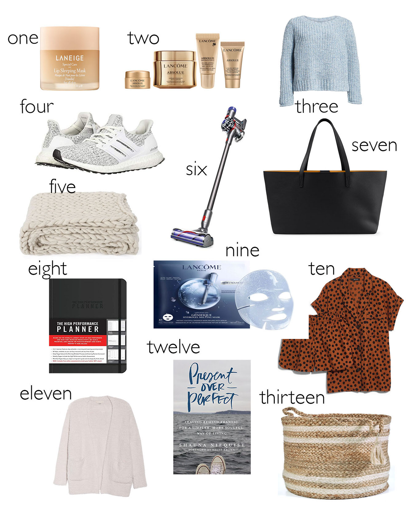 DETAILS: 1 – LIP SLEEP MASK | 2 – LANCOME ABSOLUE LINE | 3 – SWEATER | 4 – SNEAKERS | 5 – BLANKET | 6 – CORDLESS VACUUM | 7 – WORK/MOM BAG | 8 – PLANNER | 9 – SHEET MASK | 10 – PAJAMAS | 11 – CARDIGAN | 12 – NEW BOOK | 13 – BASKET