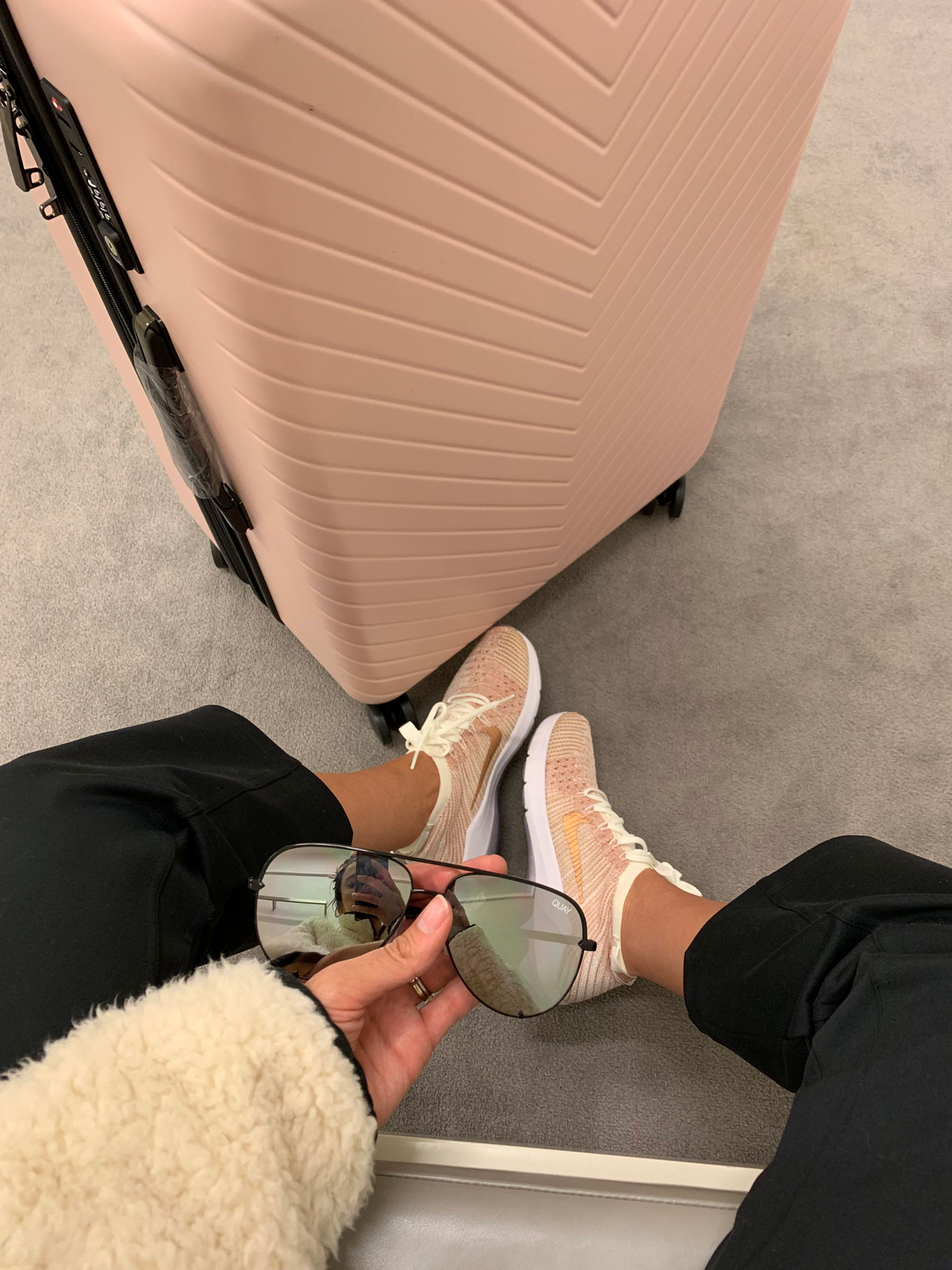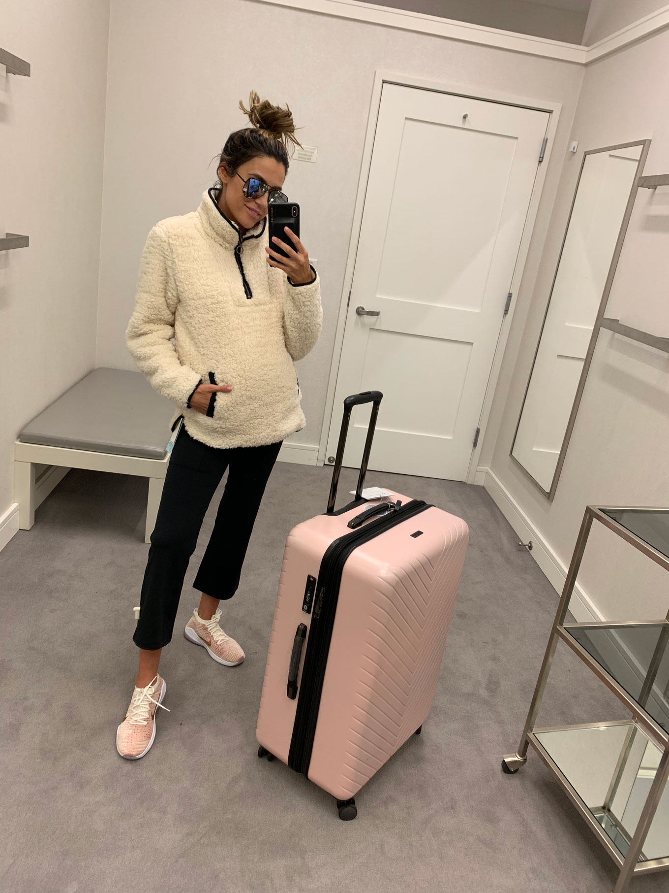 DETAILS: PINK TANK (ON SALE UNDER $50) | WHITE SHERPA PULLOVER (ON SALE UNDER $50 – WEARING SIZE M) | BLACK CROPPED LEGGINGS (ON SALE UNDER $50) | PINK SNEAKERS (ON SALE UNDER $100)  | SUNGLASSES (ON SALE UNDER $100) | PINK LUGGAGE
