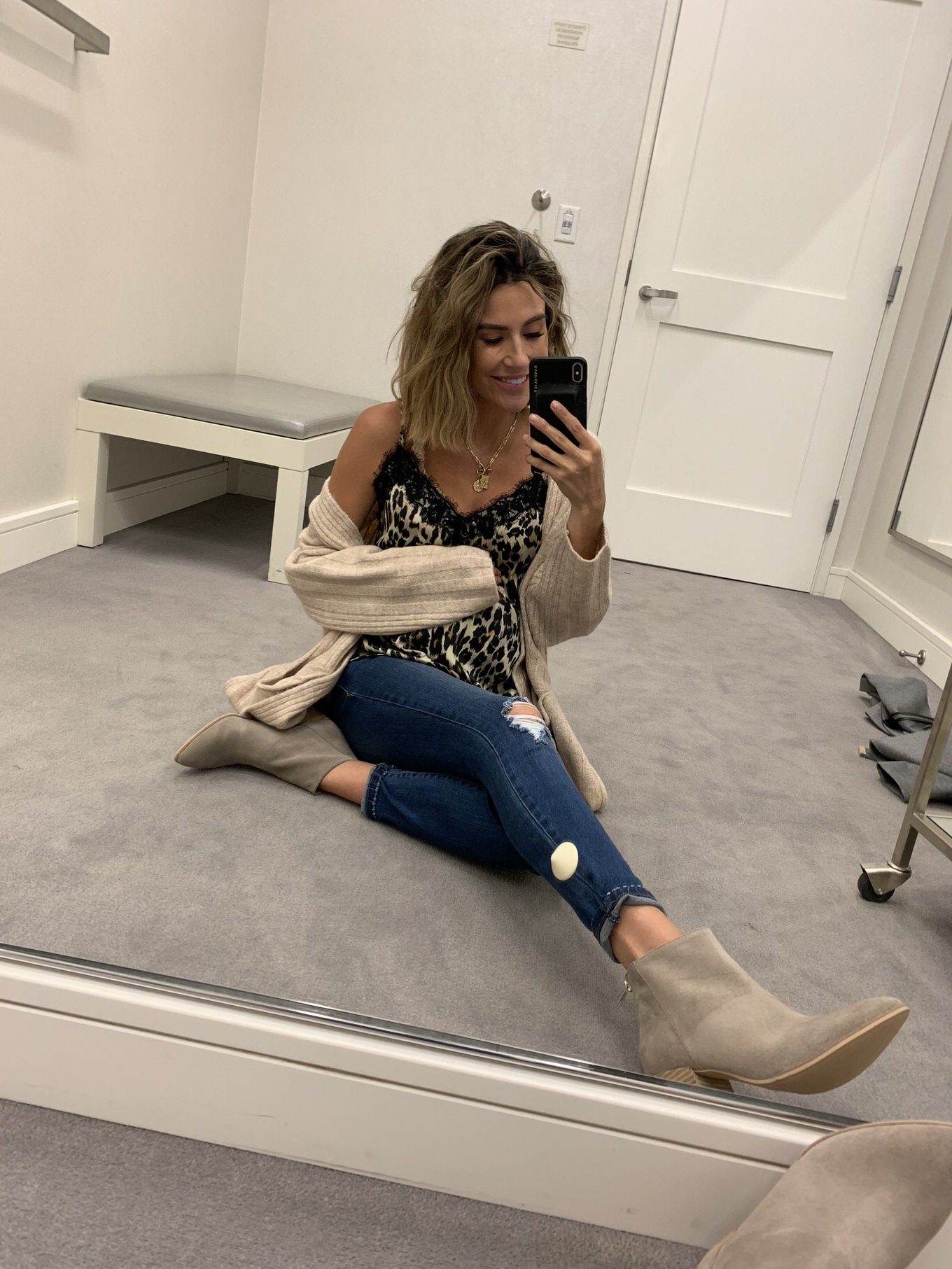 DETAILS: LEOPARD CAMI (ON SALE UNDER $30 – WEARING SIZE M) | KNIT CARDIGAN (ON SALE UNDER $50 – WEARING SIZE 4-6) | DENIM (ON SALE UNDER $100) | SUEDE BOOTIES (ON SALE UNDER $100)
