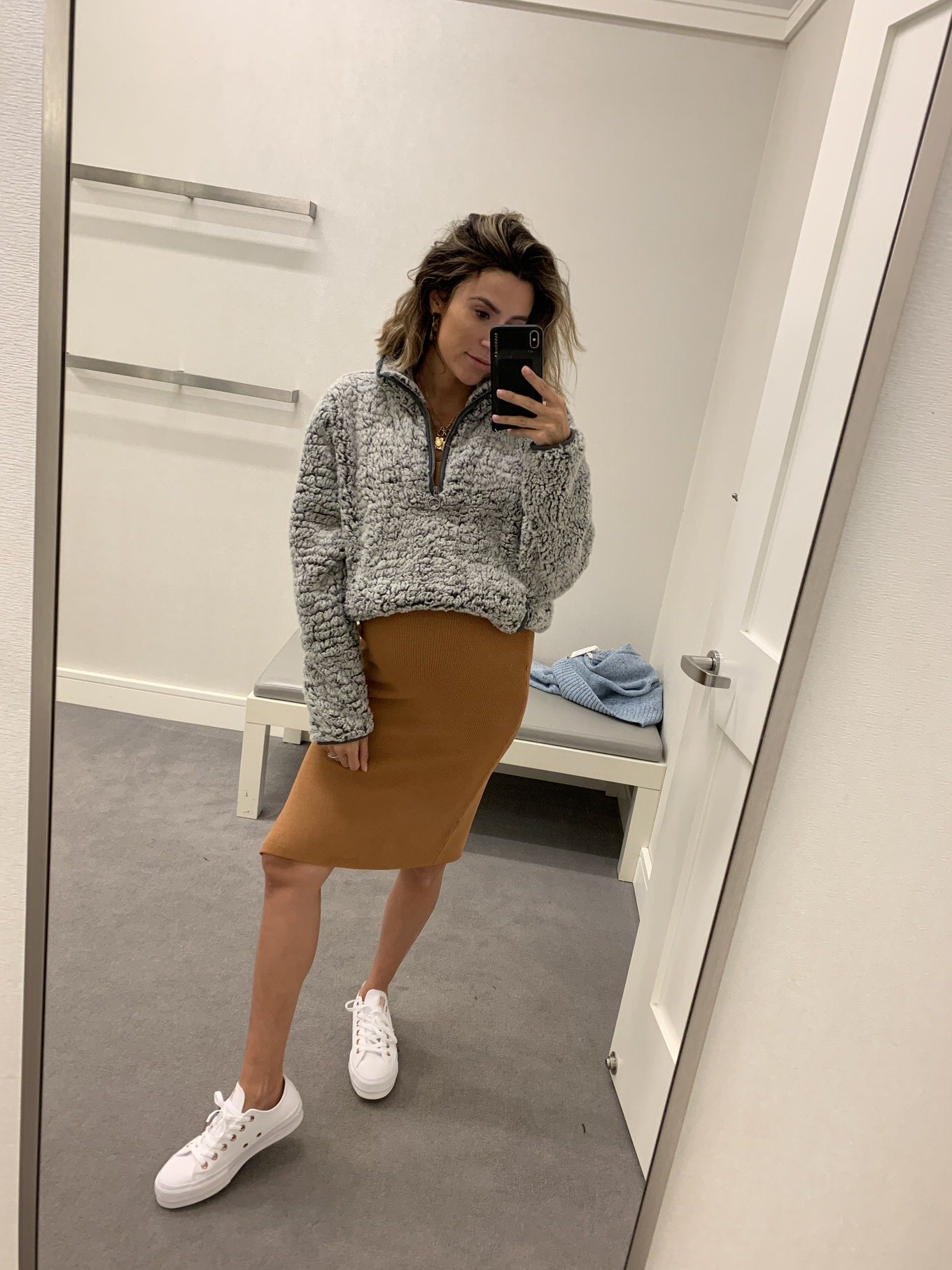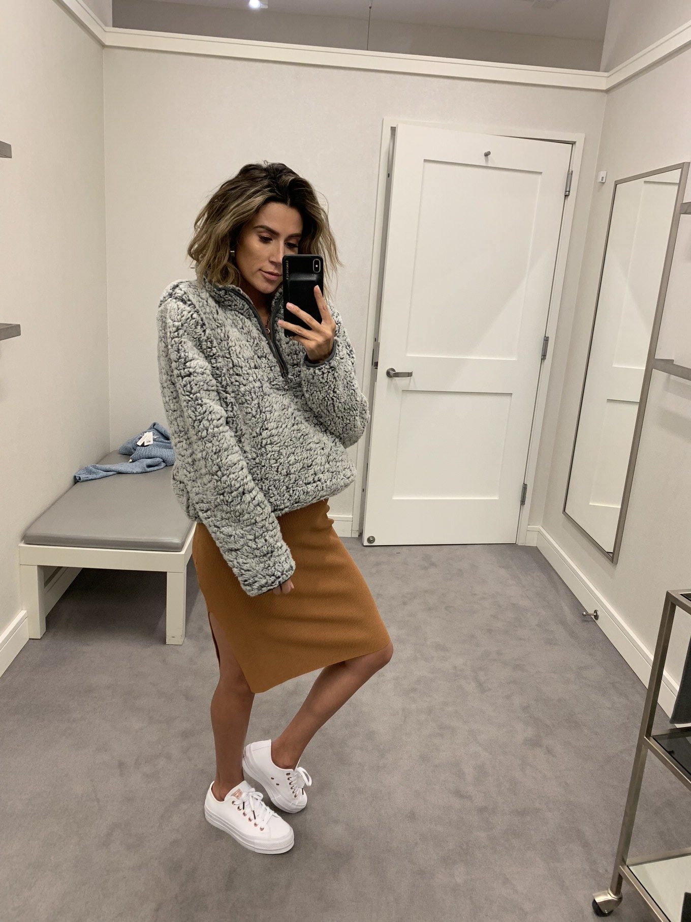 DETAILS: GREY SHERPA PULLOVER (ON SALE UNDER $50) | TAN KNIT DRESS (ON SALE UNDER $50) | WHITE CONVERSE (ON SALE UNDER $50) | GOLD NECKLACES | LV TOTE (IN STORE)
