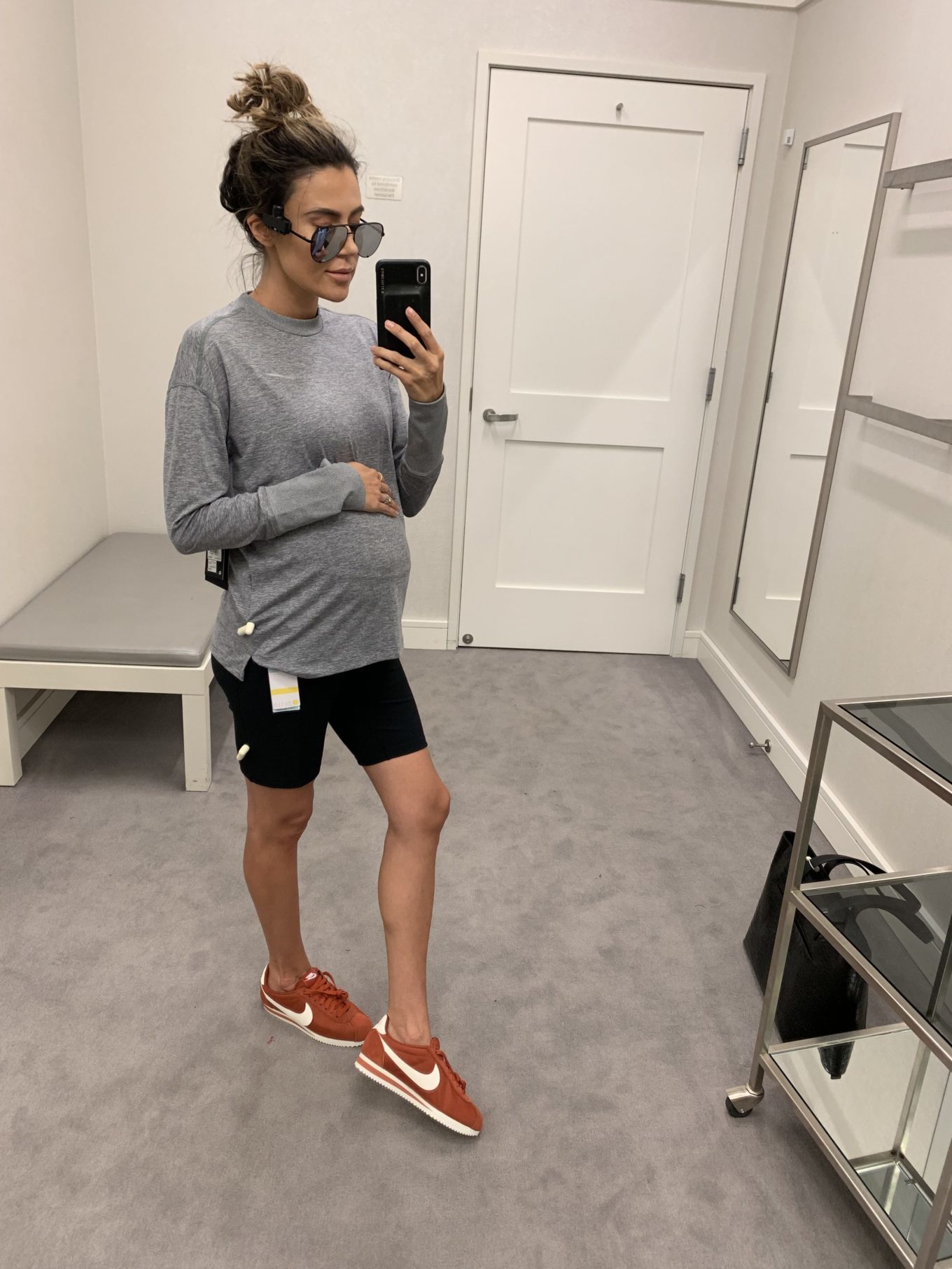 DETAILS: GREY LONG SLEEVE TEE (ON SALE UNDER $50) | BLACK BIKER SHORTS (ON SALE UNDER $50 – WEARING SIZE S) | RED SNEAKERS | SUNGLASSES (ON SALE UNDER $50)