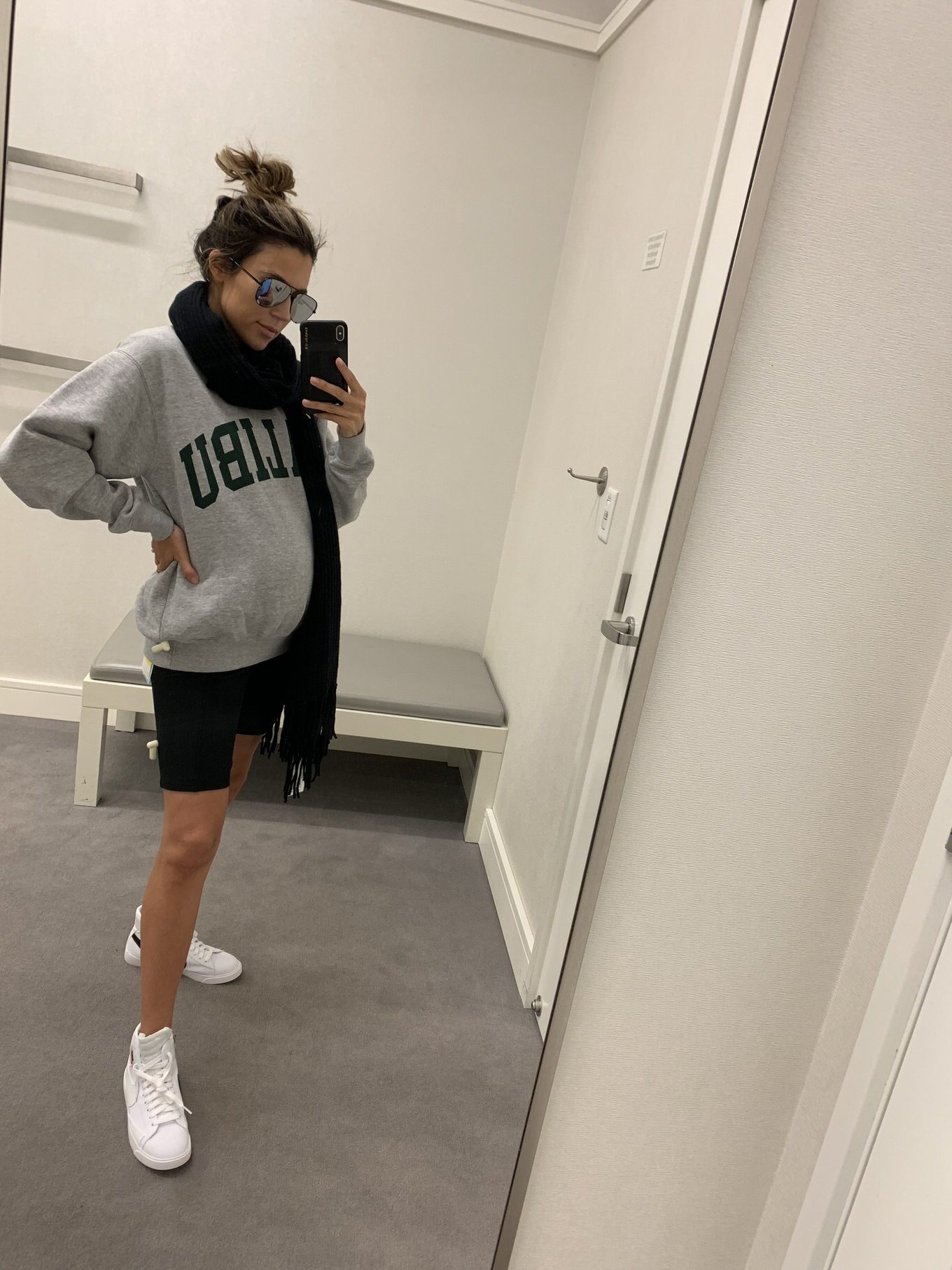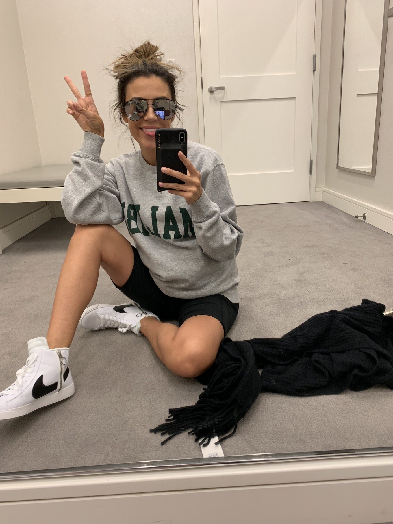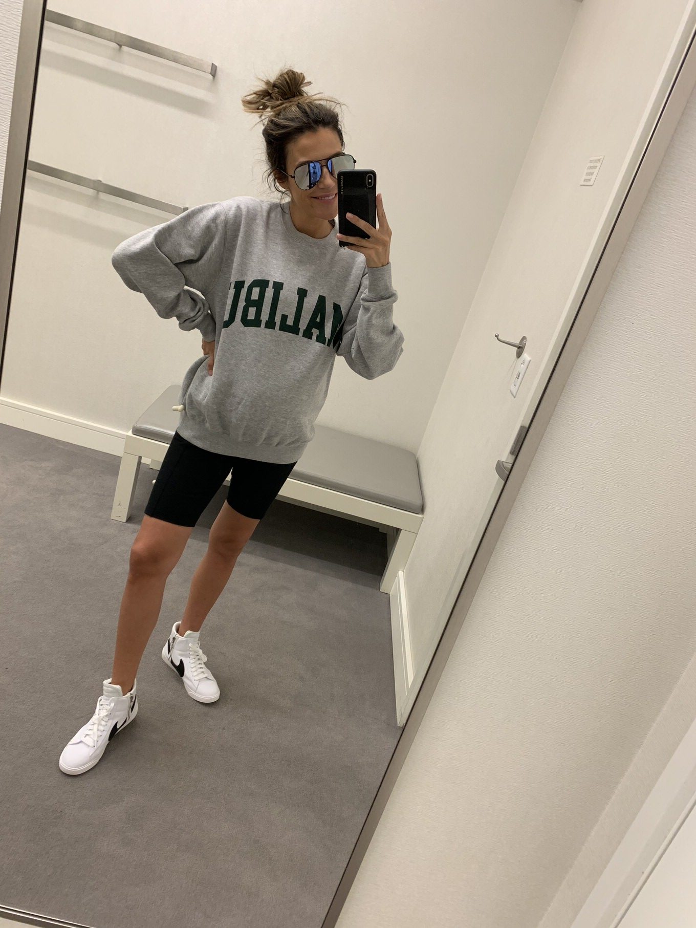 DETAILS: MALIBU SWEATSHIRT (only in store) | TASSLED SCARF | BLACK BIKER SHORTS (ON SALE UNDER $50 – WEARING SIZE S) | WHITE NIKE SNEAKERS (ON SALE UNDER $100) | SUNGLASSES (ON SALE UNDER $50)