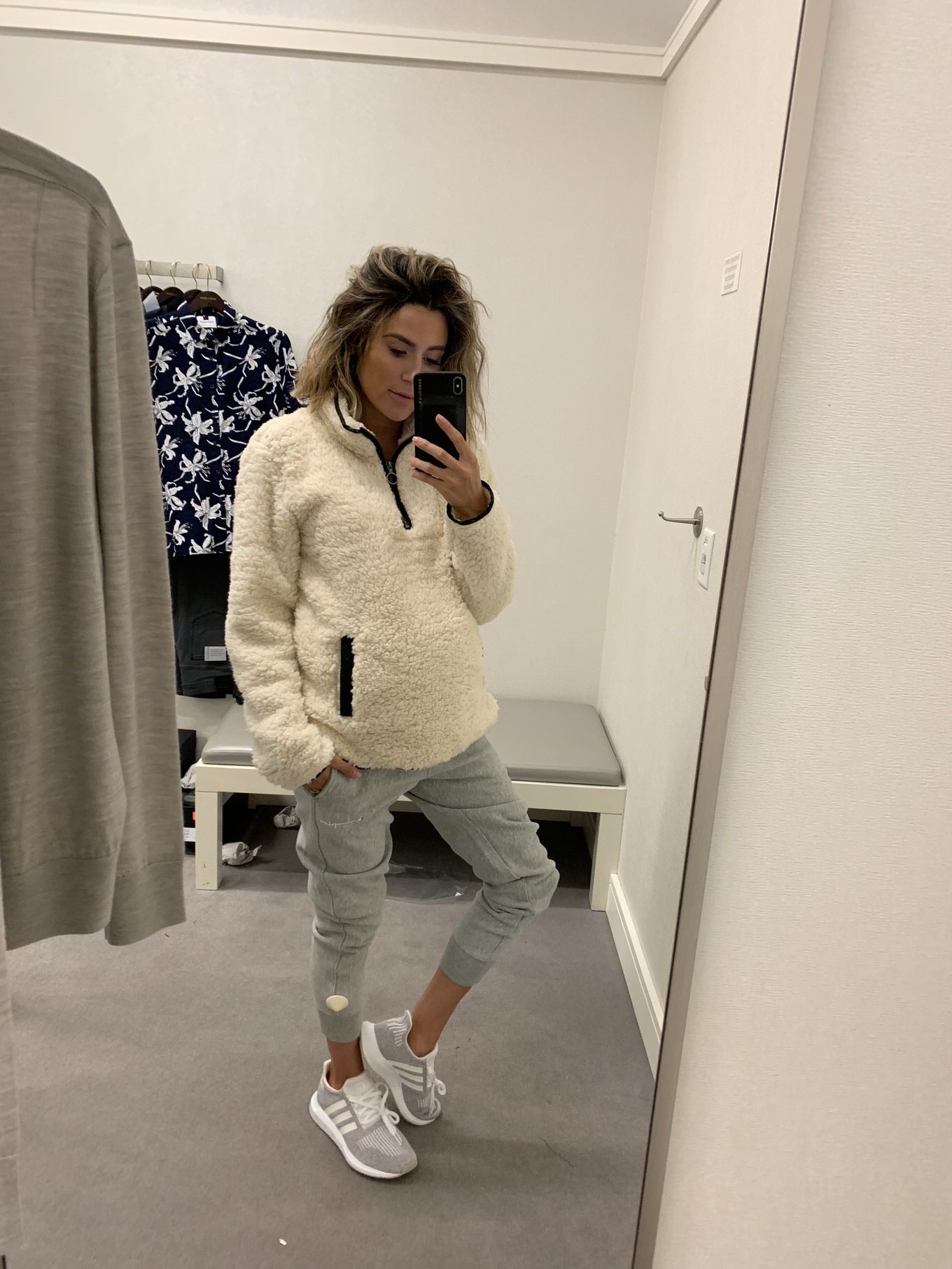 DETAILS: WHITE SHERPA PULLOVER (ON SALE UNDER $50 – WEARING SIZE MEDIUM) | GREY CHAMPION JOGGERS (ON SALE UNDER $50 – WEARING SIZE S – COMES IN 2 COLORS) | GREY ADIDAS SNEAKERS (ON SALE 25% OFF)