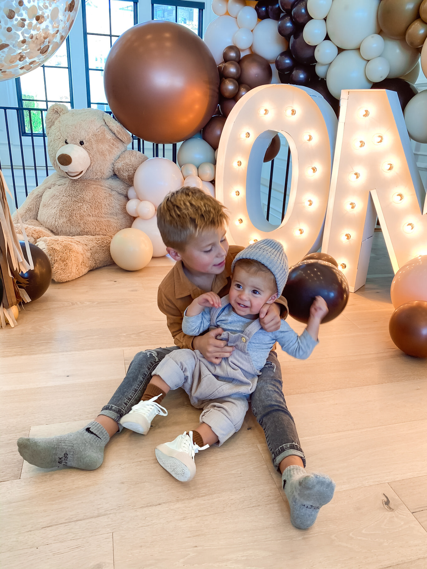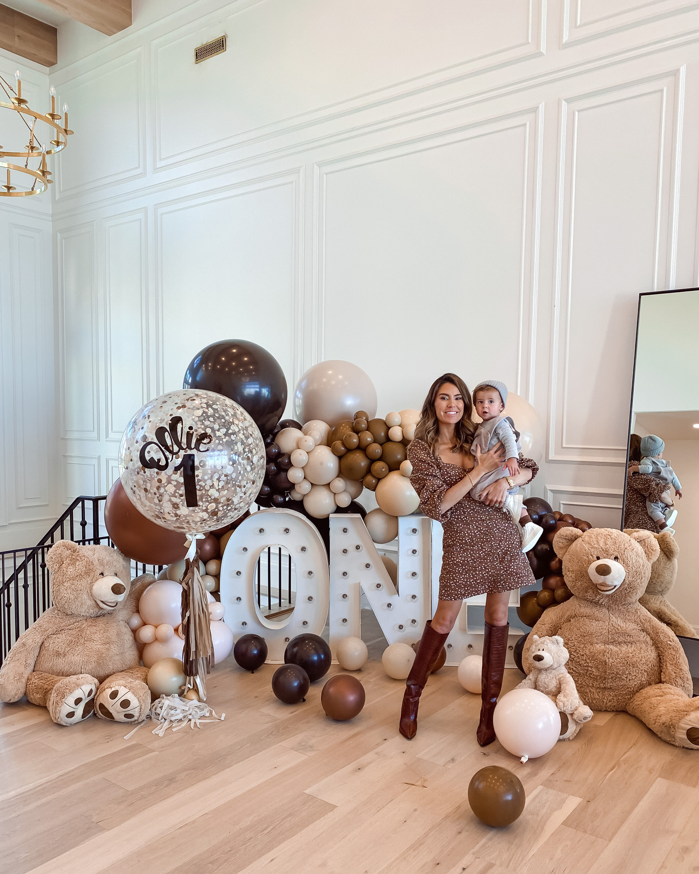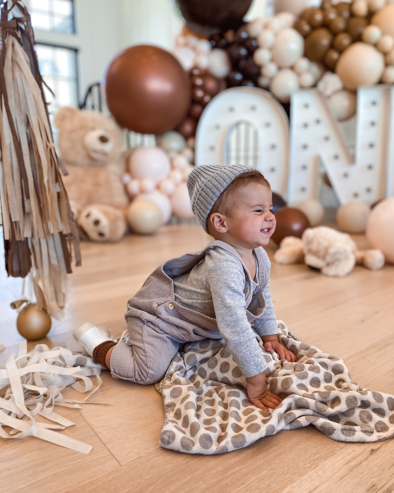 OUR BABY BOY TURNED 1!! I seriously can’t even believe it. How is he ONE! It was birthday marathon at our house last week. Wes birthday was the 26th, Ollies was the 30th, and Cody and my moms birthday was on the 4th. So it was party after party 🙂 The day before Ollie’s birthday I cried my eyes out haha. Cody and I went on a date night and in the middle of dinner I just started crying. Knowing this is most likely our last baby, all these emotions just hit thinking about how much he’s grown, our time at the NICU when he was born, it was just a flood of emotions. But then on his actual birthday it was just PURE JOY. When I was little I got a teddy bear I carried everywhere named Oso (spanish for bear – I was fluent in Spanish as a little girl 🥰). So I was up super late one night (my creativity always hits super late at night) and it hit me how cute would a teddy bear theme be for his first birthday! I found this ADORABLE bear that’s actually the same brand as the one I had growing up. 🙂 So I ended up using that teddy bear as inspo for the theme and love how it turned out, especially with all the fall tones.