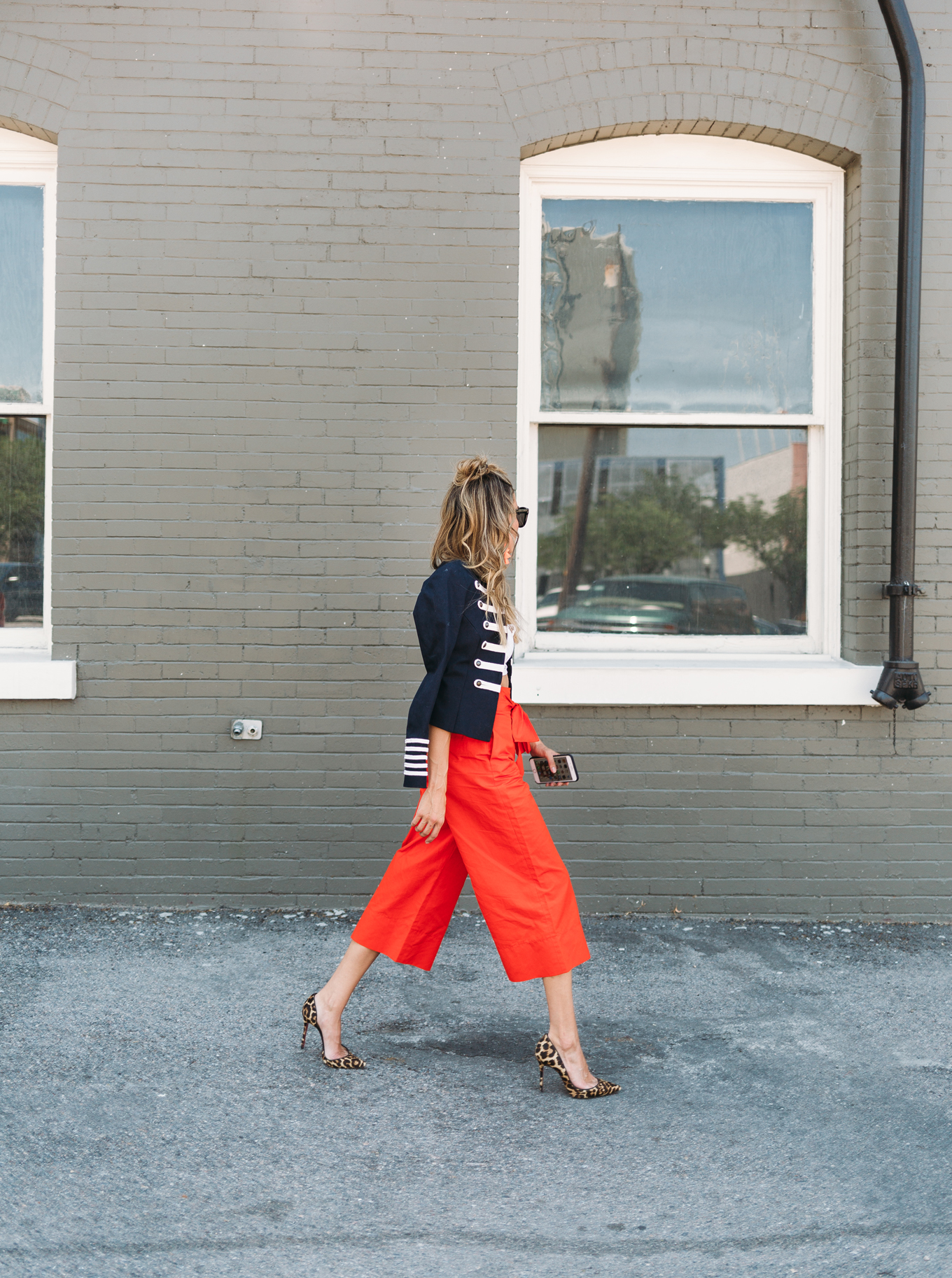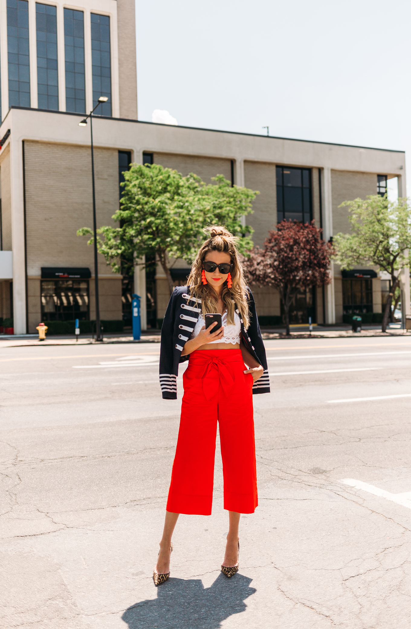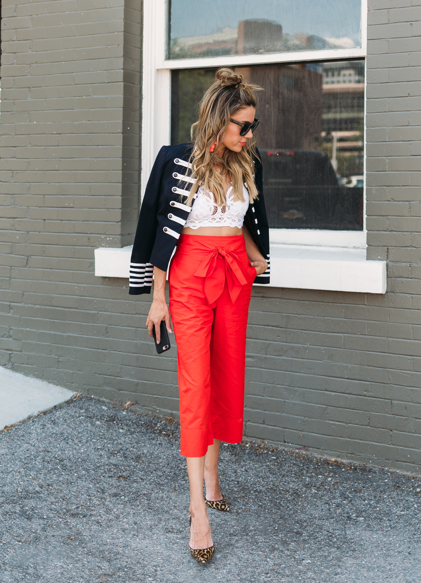 DETAILS: WHITE BRALETTE TOP (UNDER $50) | MILITARY JACKET (SIMILAR HERE UNDER $100) | RED BOW PANTS | LEOPARD PUMPS | SUNGLASSES | TASSEL EARRINGS (SIMILAR HERE)