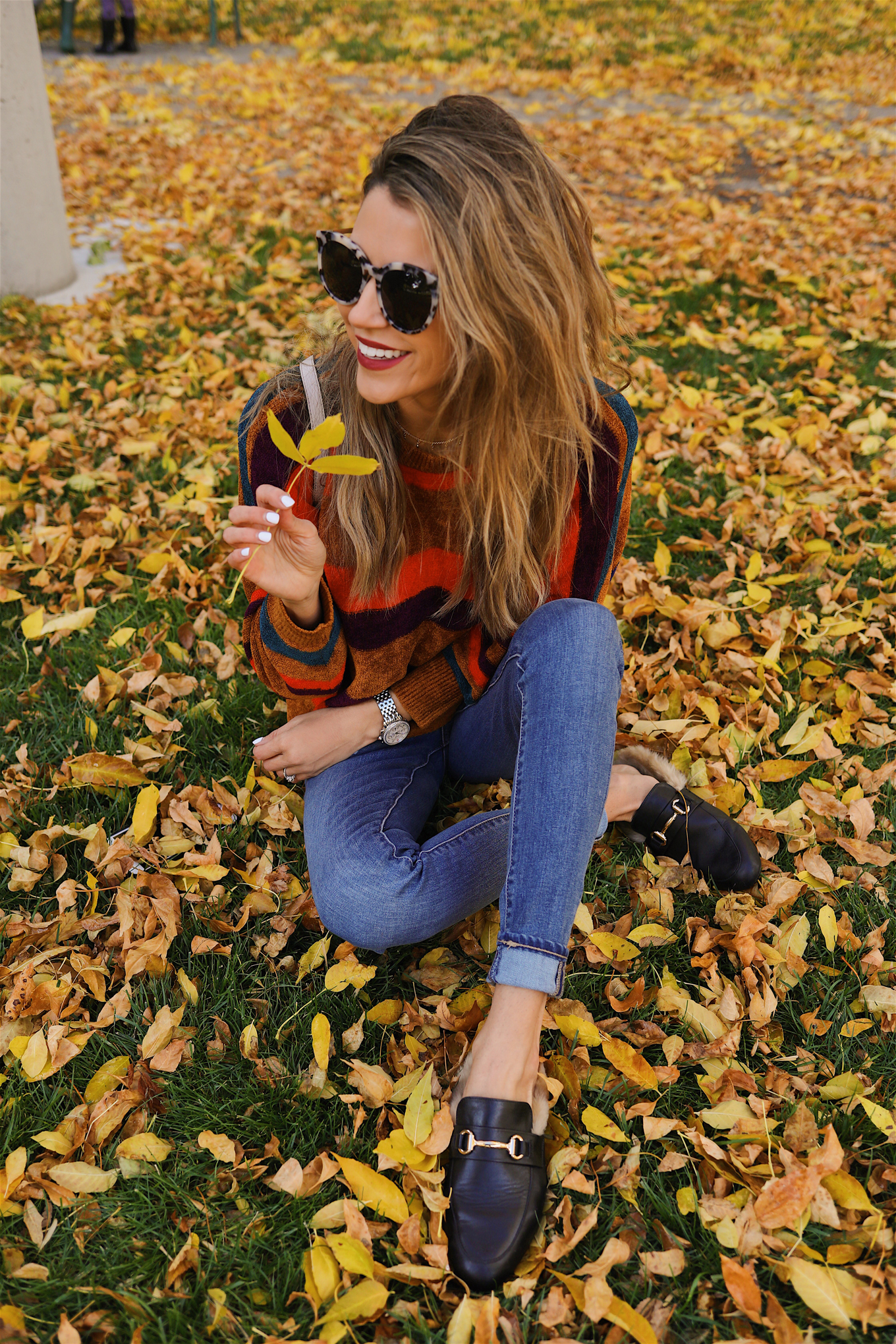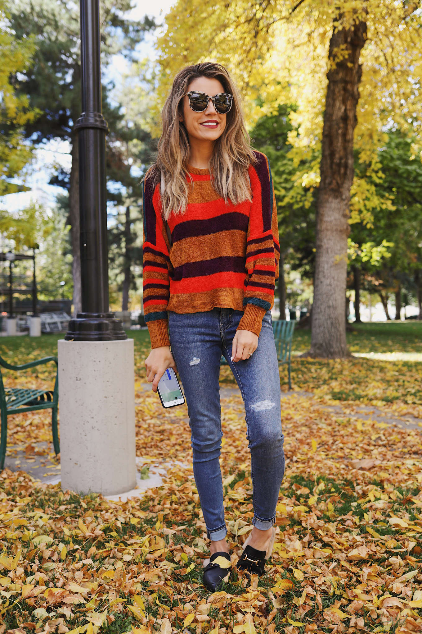 Loving this sweater, so love stripes!! Theses are great colors together, perfect for fall. It also looks really comfortable! I also like the oversized stylish sunglasses you put with the outfit as well.