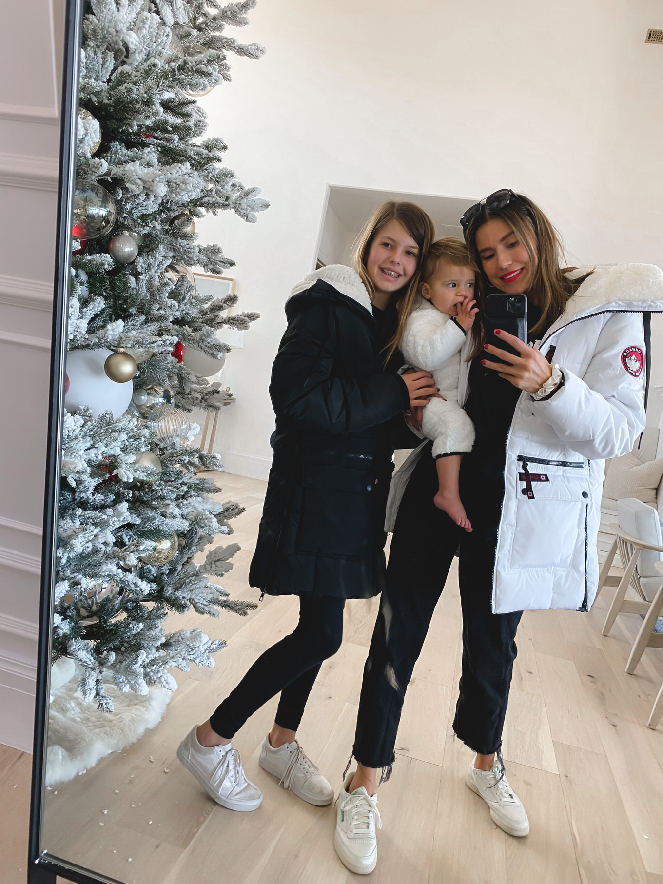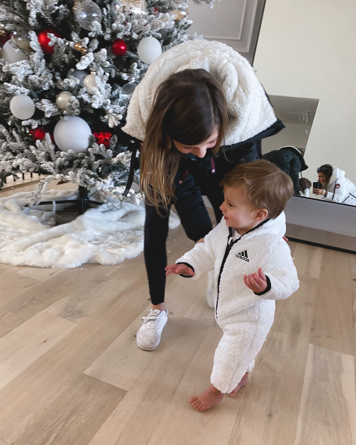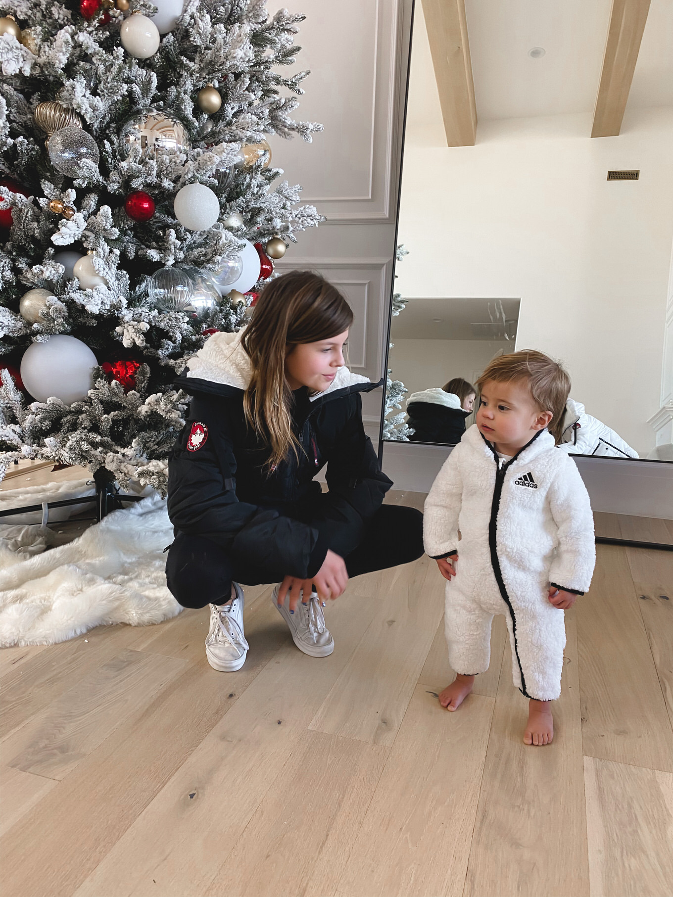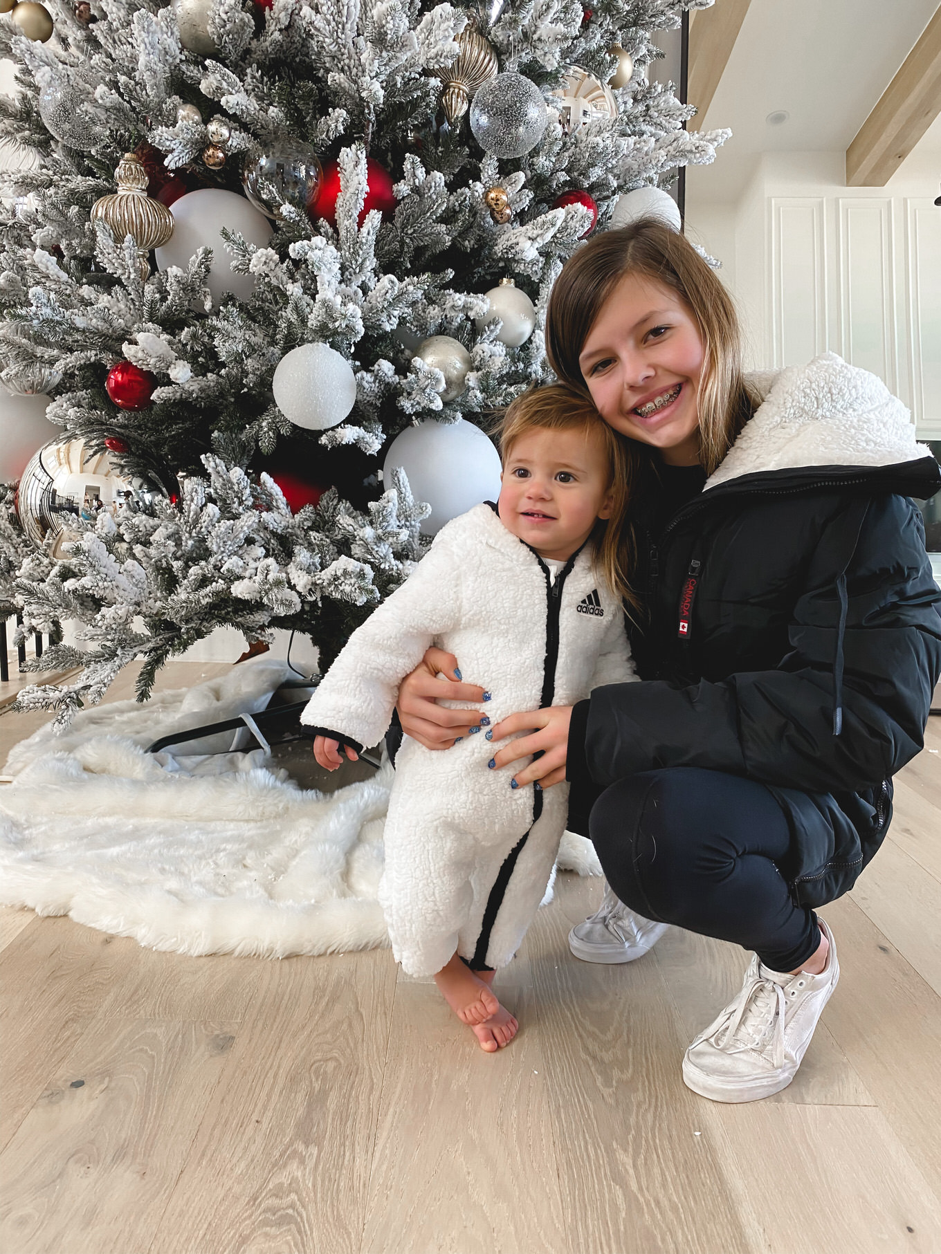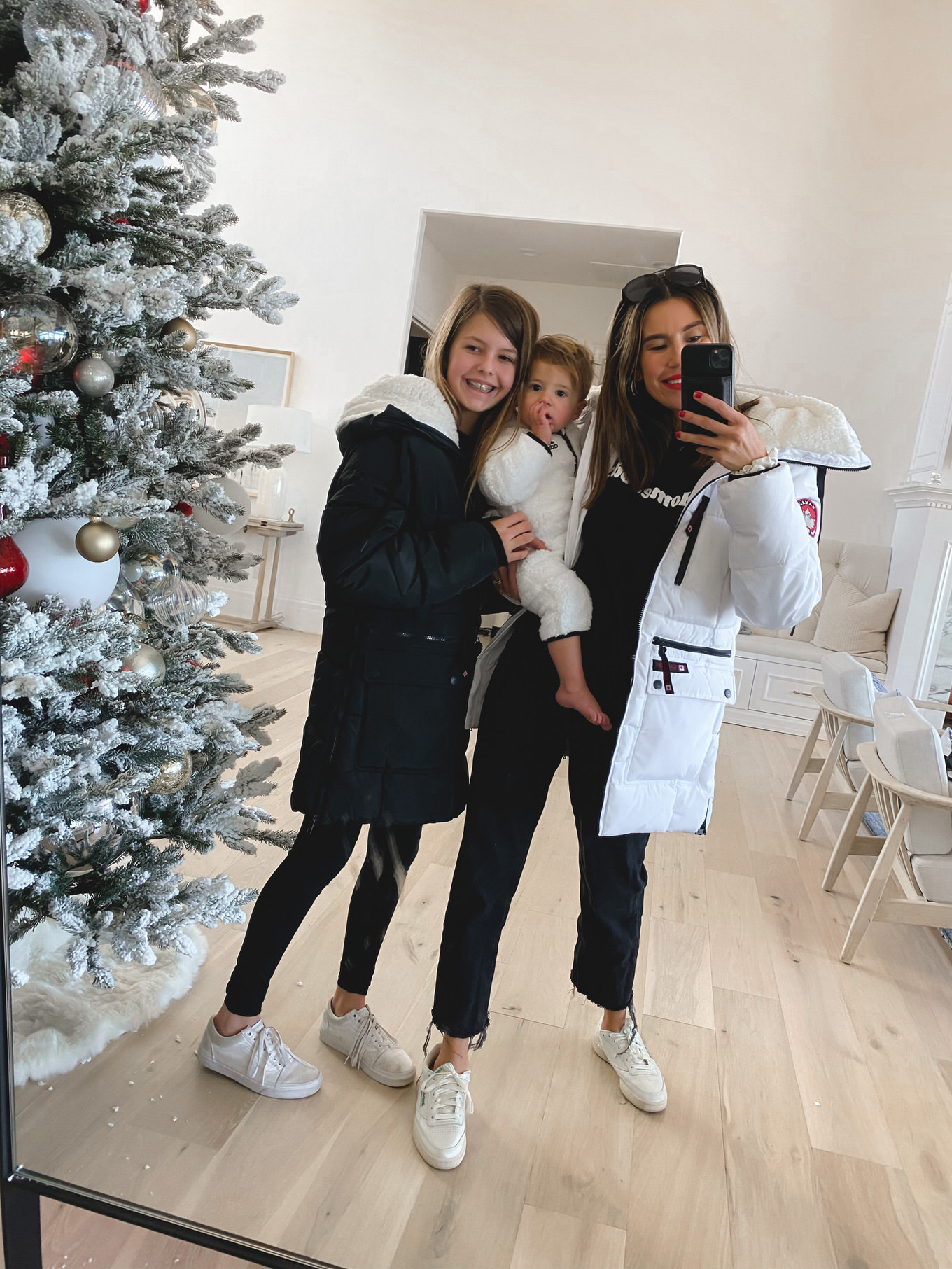 DETAILS: WHITE SHERPA PUFFER COAT (UNDER $100 – WEARING SIZE SMALL) | MARA’S BLACK SHERPA PUFFER COAT (ON SALE UNDER $100) | OLLIE’S PLUSH PLAYSUIT | BECKAM + WES MATCHING TEES