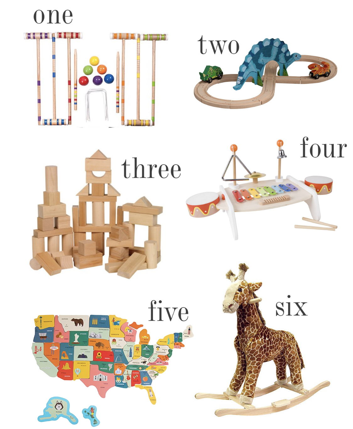 DETAILS: 1. CROQUET SET (UNDER $40) | 2. DINOSAUR TRACK (UNDER $20) | 3. WOOD BLOCK SET (UNDER $15) | 4. WOODEN MUSIC TABLE (UNDER $50) | 5. MAGNETIC USA MAT (UNDER $20) | 6. GIRAFFE ROCKER (UNDER $50)
