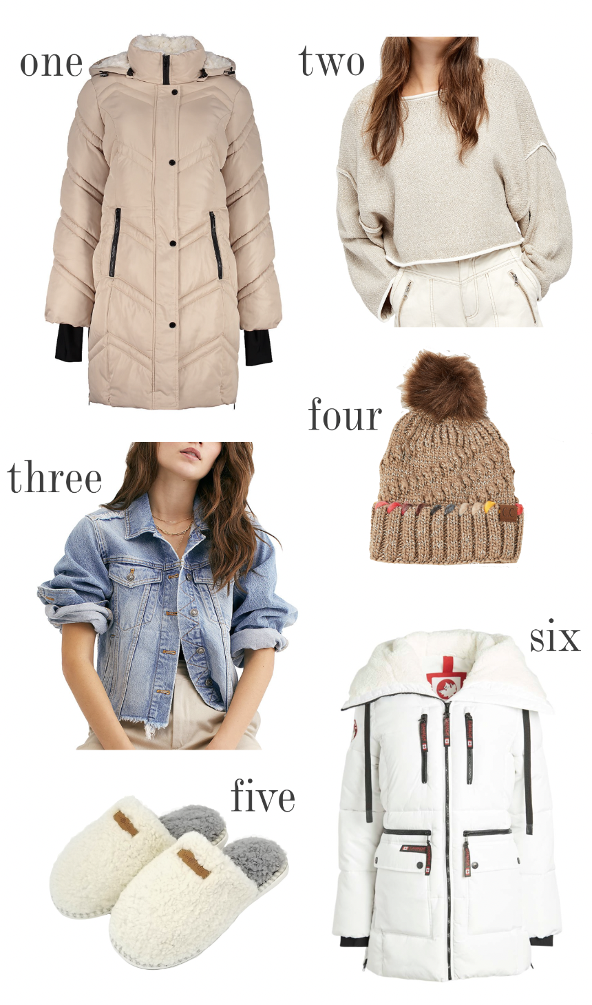DETAILS: 1. STEVE MADDEN TAN PUFFER COAT (UNDER $50) | 2. FREE PEOPLE SWEATER (UNDER $50) | 3. FREE PEOPLE DENIM JACKET (UNDER $100) | 4. KNIT BEANIE (UNDER $20) | 5. SLIPPERS (UNDER $15) | 6. WHITE SHERPA-LINED COAT (COMES IN 4 COLORS)
