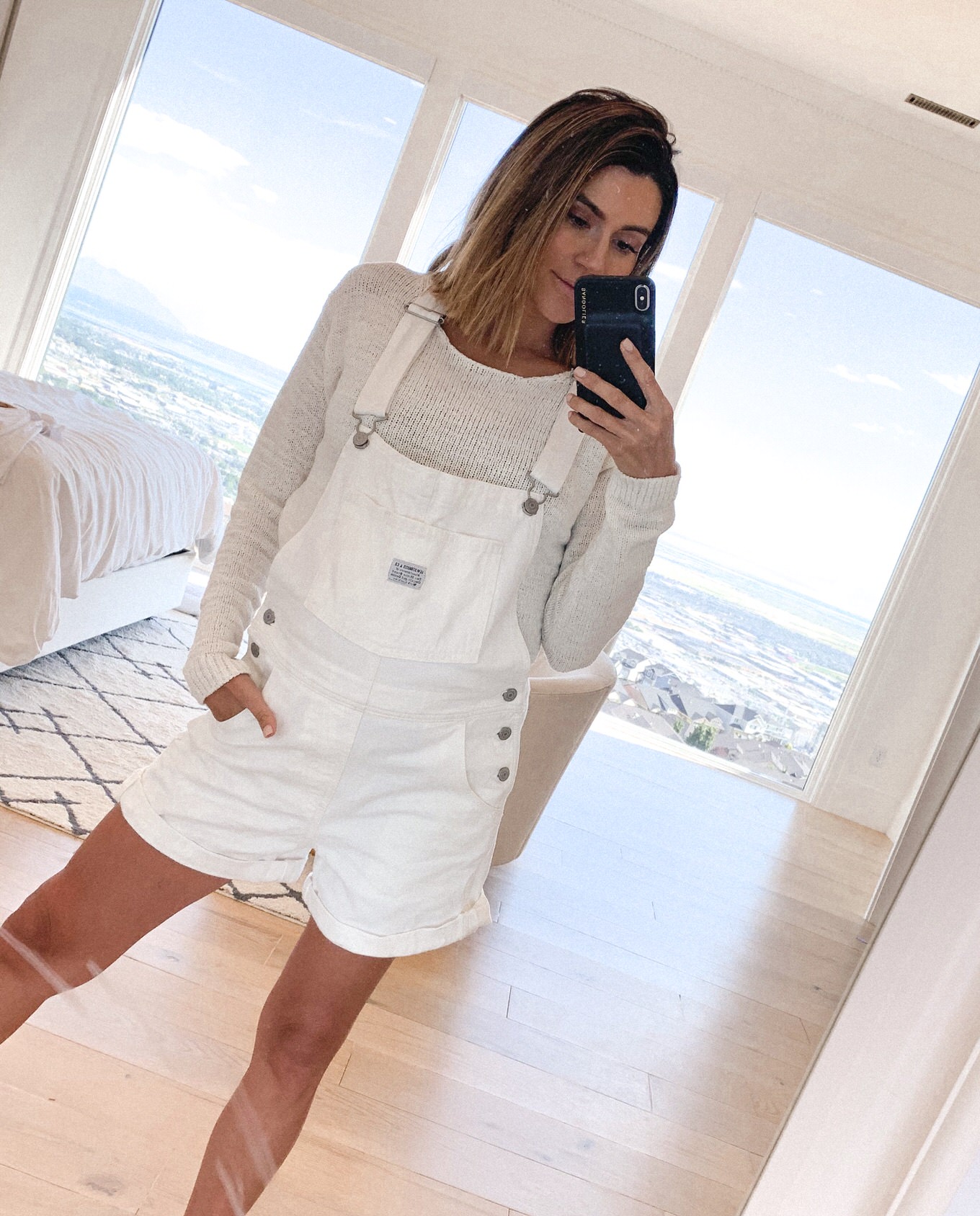 DETAILS: OVERALL SHORTS (MORE SIZES HERE) | KNIT PULLOVER SWEATER (old you can really do any cute white sweater under – love this one under $20)