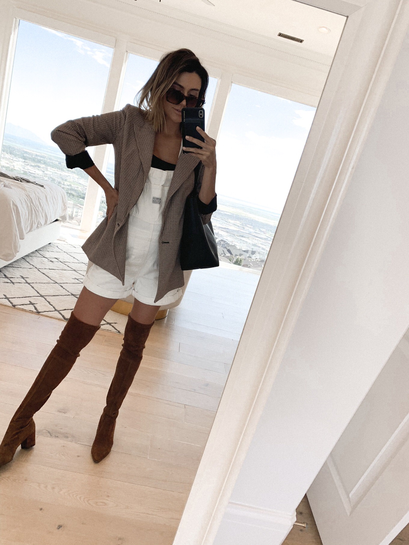 DETAILS: OVERALL SHORTS (MORE SIZES HERE)| PLAID BLAZER (ON SALE UNDER $100 – SIMILAR HERE) | BLACK TANK | BROWN OVER-THE-KNEE BOOTS | BLACK TOTE | SUNGLASSES (SIMILAR HERE)