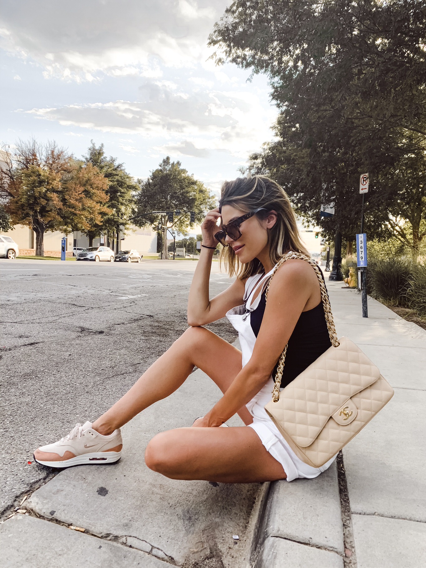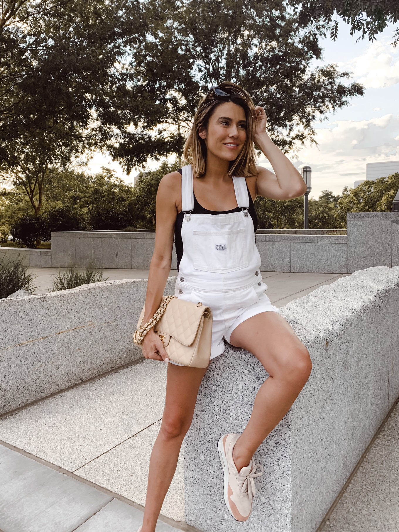 DETAILS: OVERALL SHORTS (MORE SIZES HERE)| BLACK TANK | NUDE CROSSBODY | SNEAKERS (OLD – SIMILAR HERE)