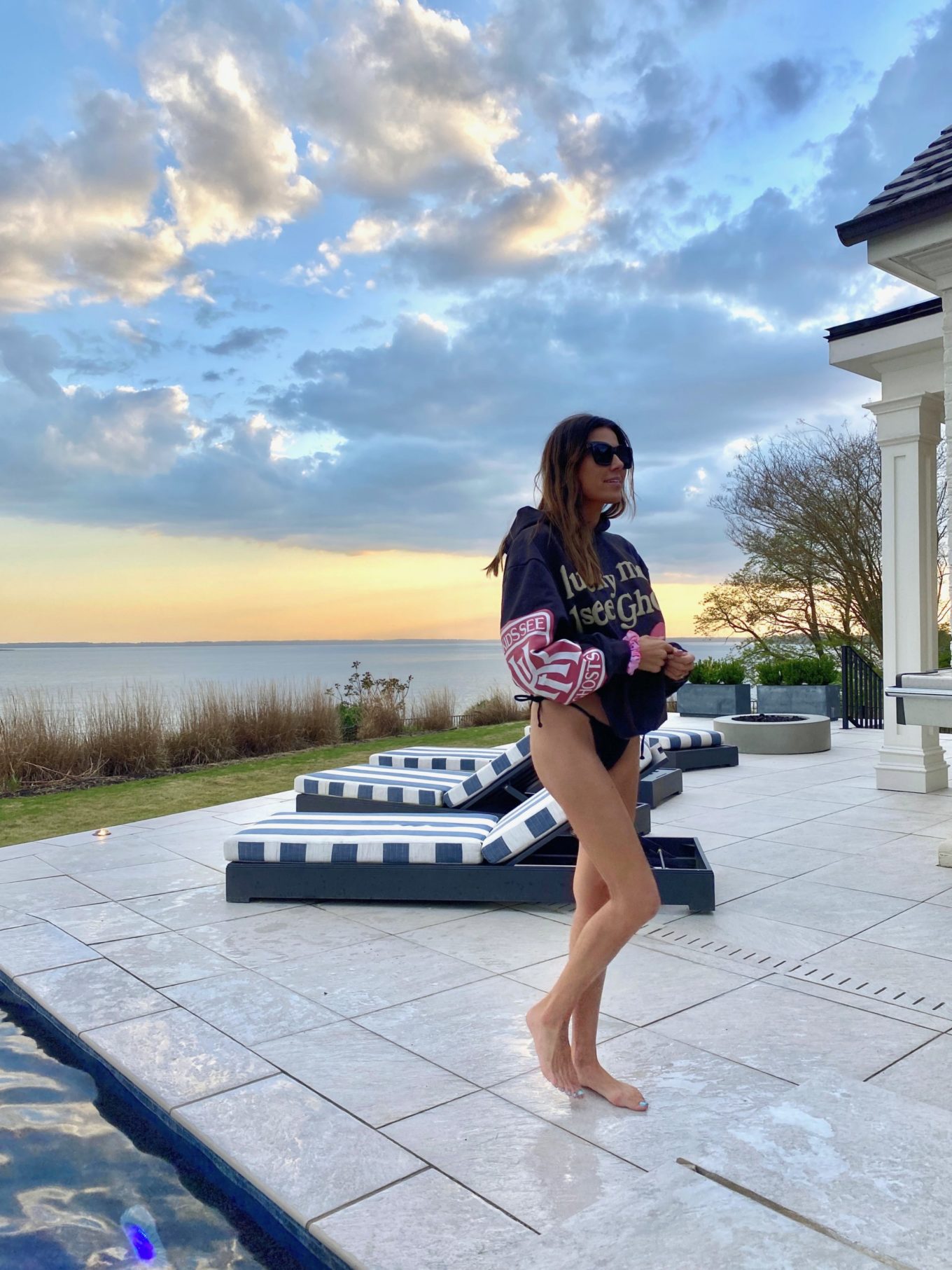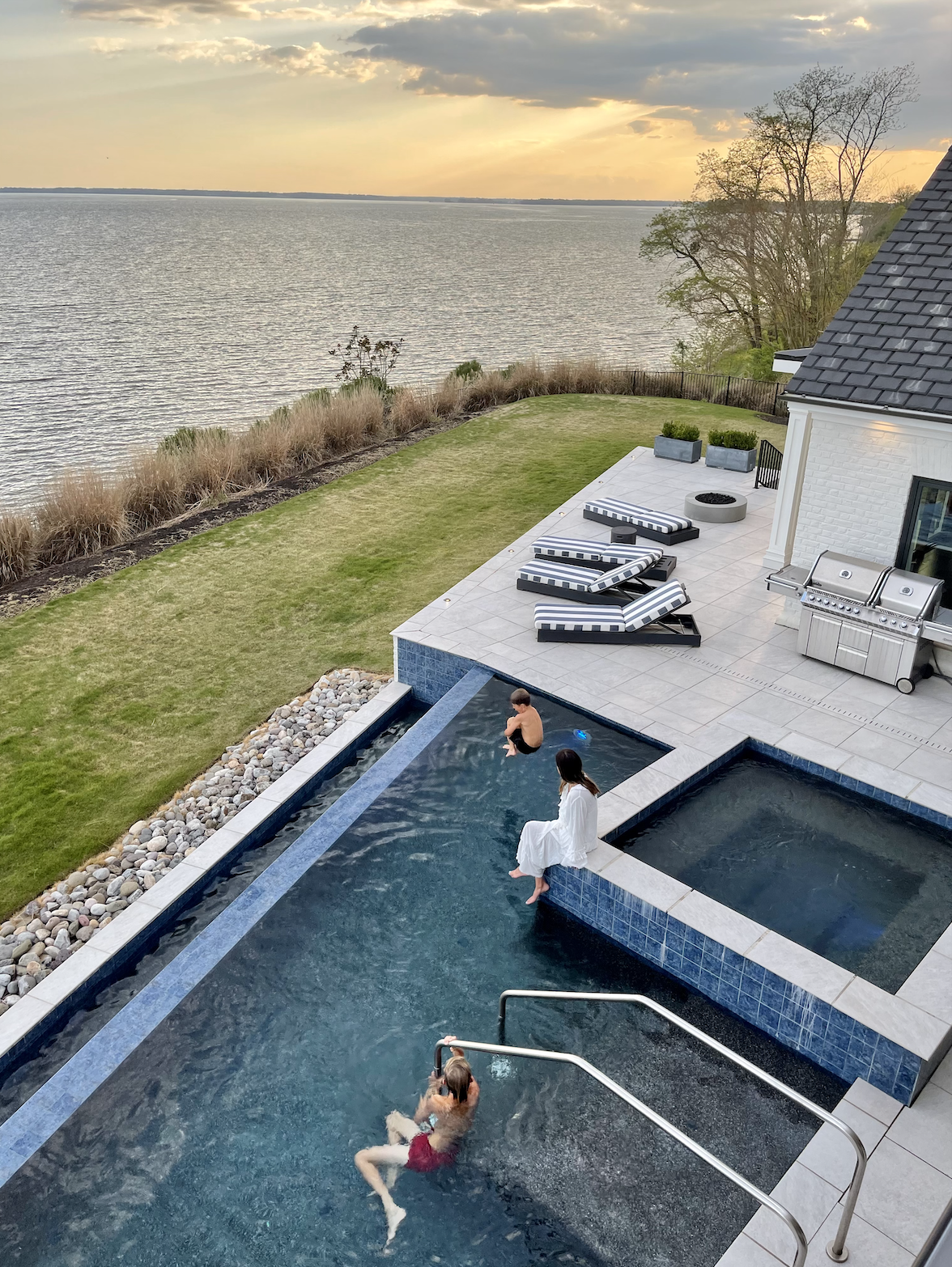 We were there pre-season, so the outdoor pool wasn’t open yet, but since we were there with Visit Williamsburg, they let us check out the pool at The Estate at Kingsmill. It used to belong to the Busch Family (of Busch Gardens and Budweiser Beer), but they sold it to Kingsmill, so now it’s available as a luxury rental. The home is so gorgeous! The decor is sooo stunning and all of the bedrooms are insane. It would make for an amazing family vacation rental for a big family get-together! We loved spending our nights swimming there!