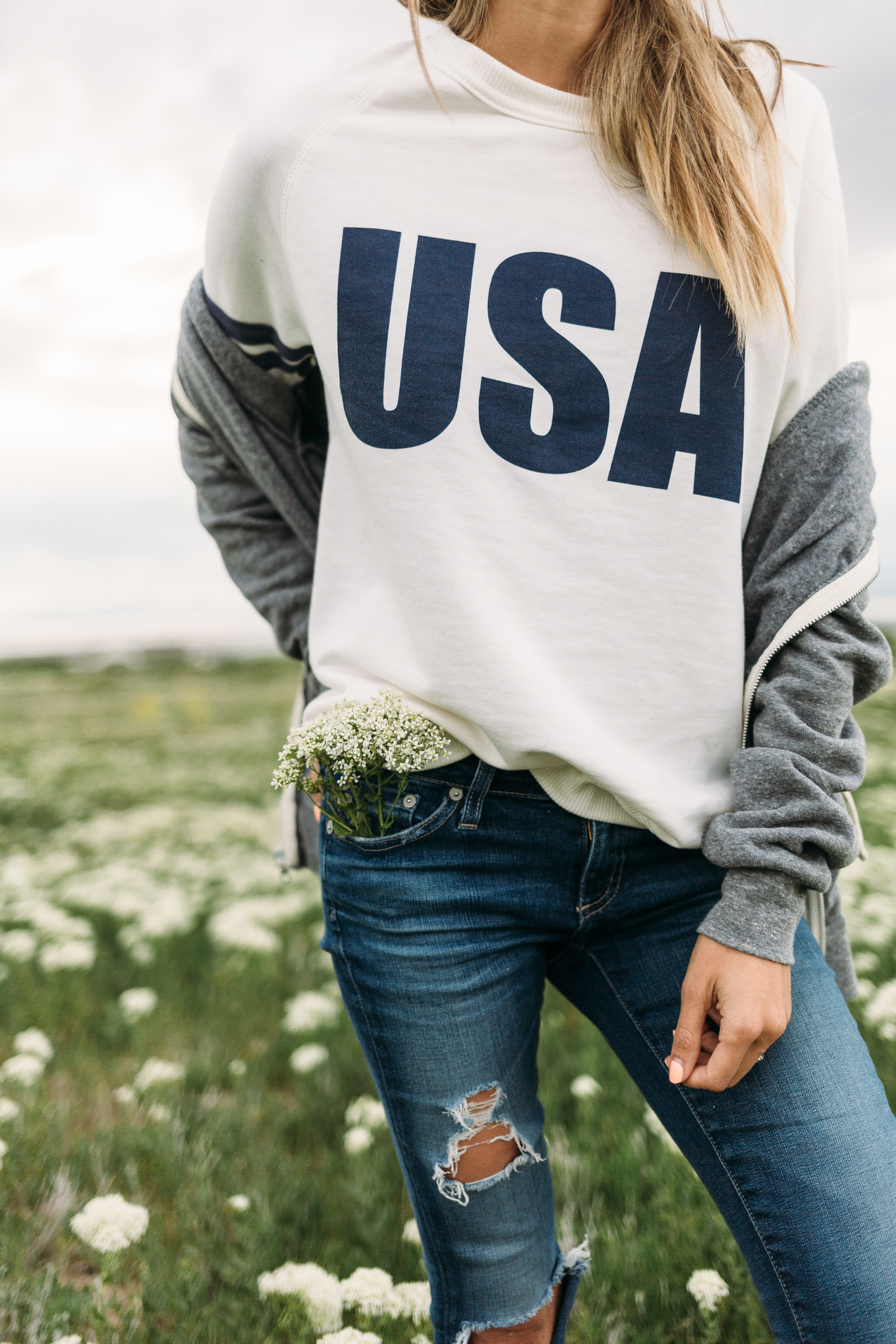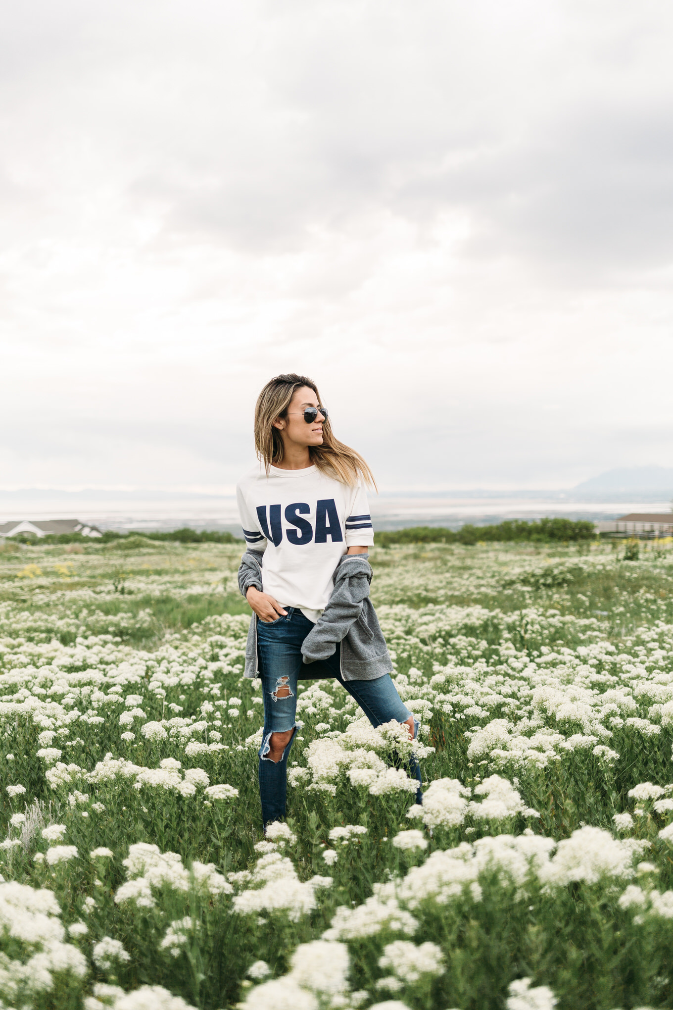 Happy Memorial Day! We are up in Sun Valley for the long weekend with Cody’s family. Love coming up here with them, it’s a yearly tradition! He’s been coming since he was a baby. I wore this outfit for the road trip up. This USA tee is one of my favorites (although let’s be honest, I’ll probably say that about all of our ILY graphics I just get really excited to design new pieces). I love the striped sleeves for a vintage varsity feel and it’s a simple tee you can wear with anything.