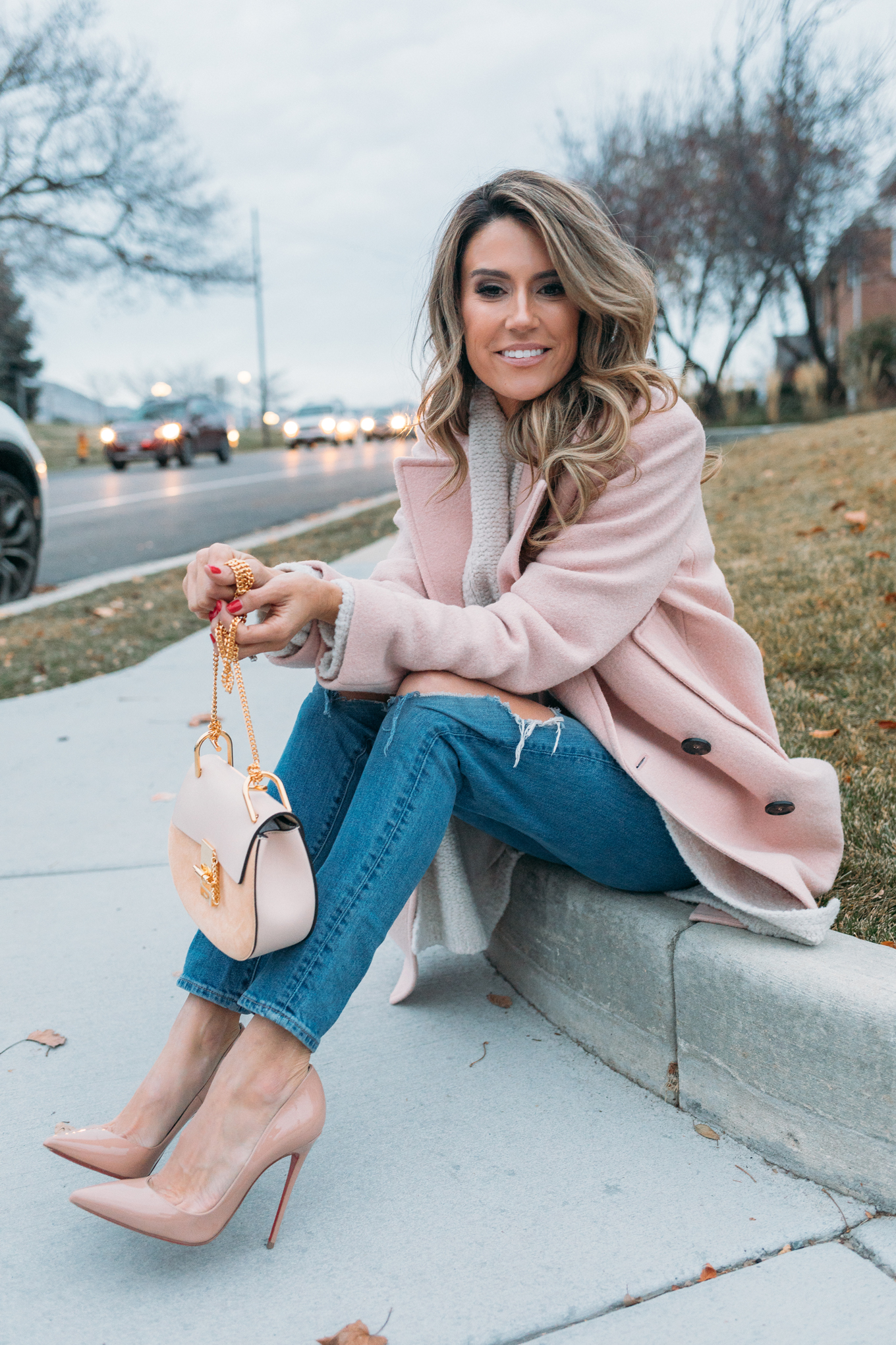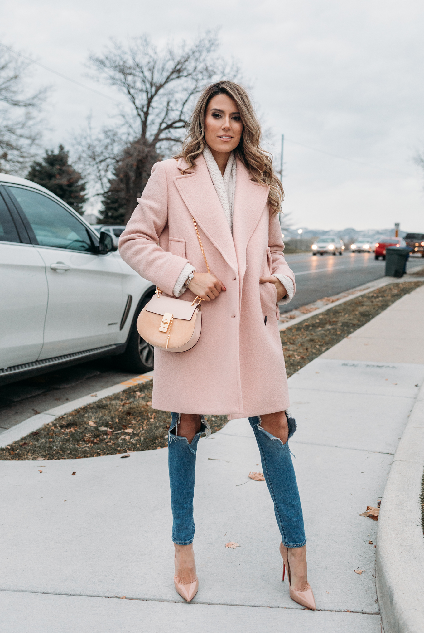 DETAILS: BLUSH LACE CAMI | SHERPA CARDIGAN | BLUSH WOOL CAPE COAT | BLUSH AND NUDE CROSSBODY |  DENIM (UNDER $100) | NUDE PUMPS